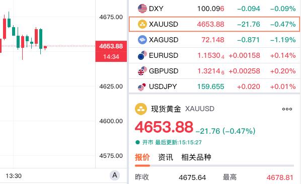 现货黄金依旧弱势震荡, 虽然一度翻红, 但是终究昙花一现,再度回落。 现货黄金报价4653.88美元, 较上一日回落21.76美金。 盘中最高4678.81美元。 期货小褚认为 现货黄金下方支撑比较强, 有望止跌回升,再度上涨!
