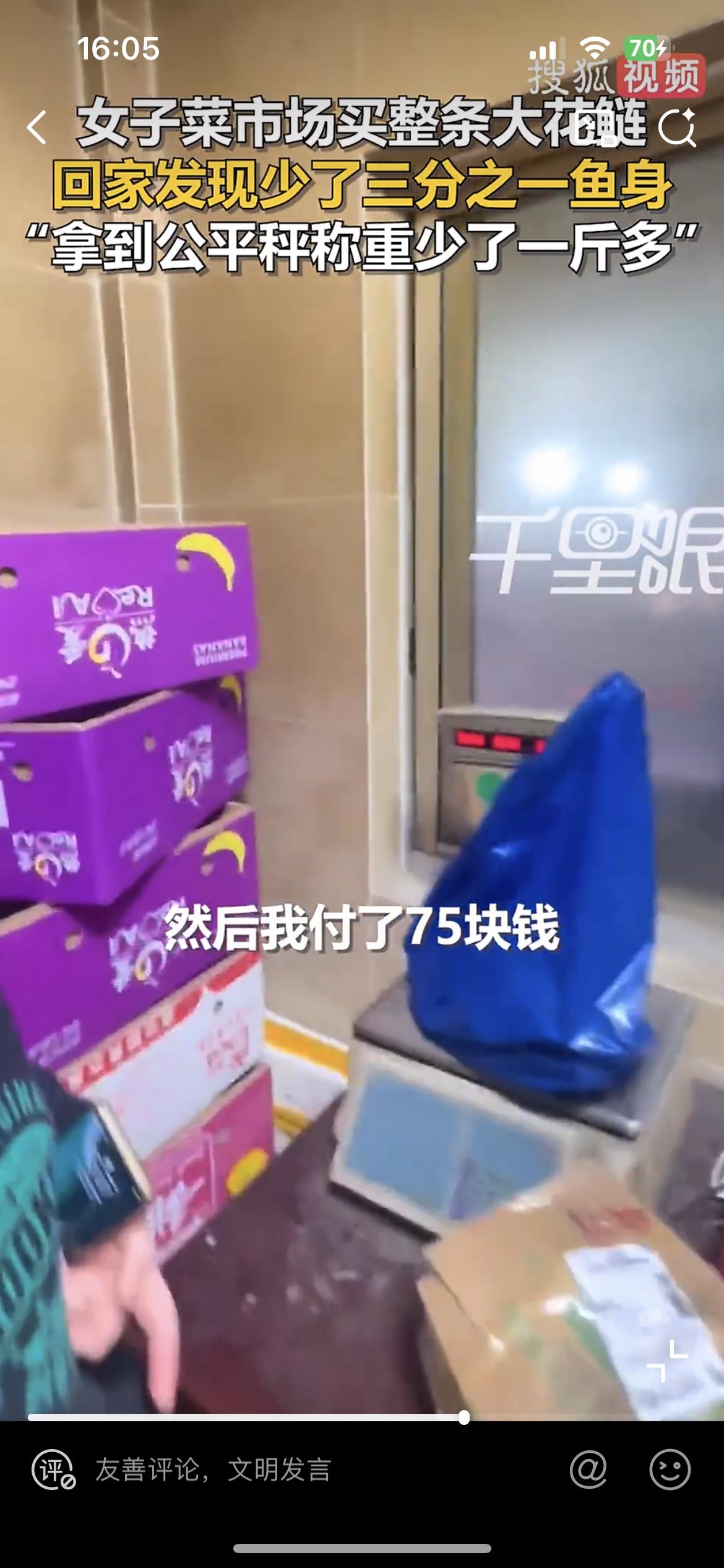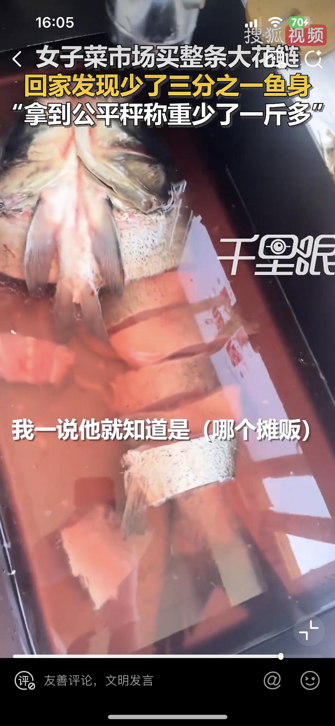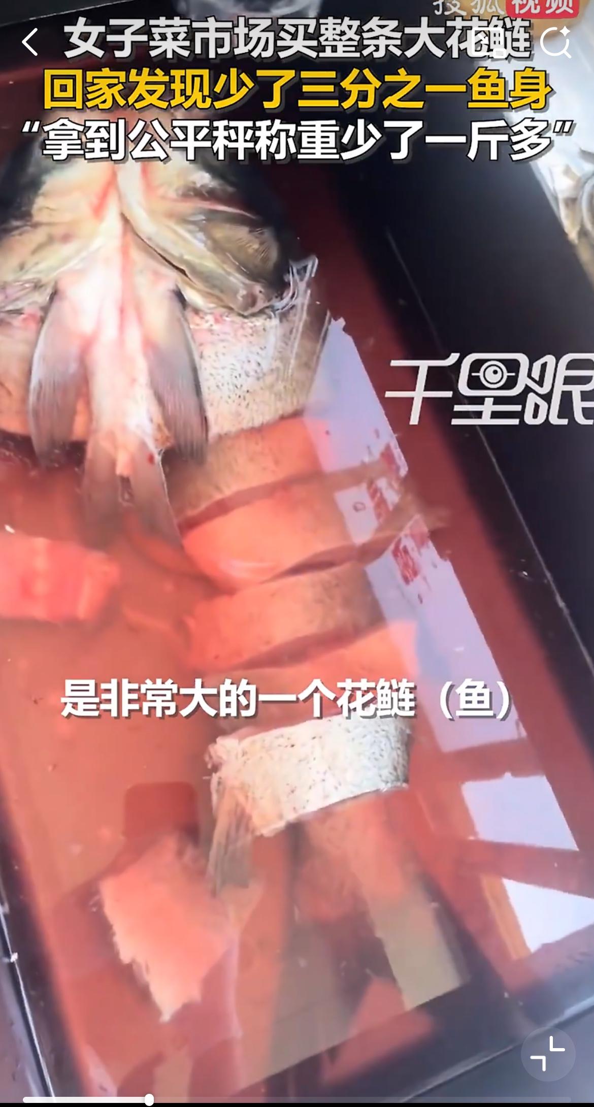 宁波女子菜市场遭遇杀鱼陷阱,一条 6 斤多重的花鲢竟然少了 1/3 的鱼身。4 月 5 日,这名女子在一菜市场买了一条鲜活的花鲢,12 块一斤,6 斤多,他给了 75 块钱。鱼贩给她当场宰杀,清洗干净以后,装袋拿回家。再次清洗的时候发现鱼身明显不对,他耐着性子把鱼身拼凑起来发现少了一大截。气愤不已的女子拿着鱼想去找鱼贩讨说法,没想到鱼贩已经提前开溜了。她把鱼拿到市场的公平秤复秤,发现只有四斤七两。向市场管理方投诉,没想到工作人员对鱼贩的姓名脱口而出,显然这名女鱼贩是一名惯犯,可能被消费者投诉多了。鱼贩搞秤的伎俩一般就是八两秤或者多喊秤,因为他杀鱼以后,基本上就很难复秤了。