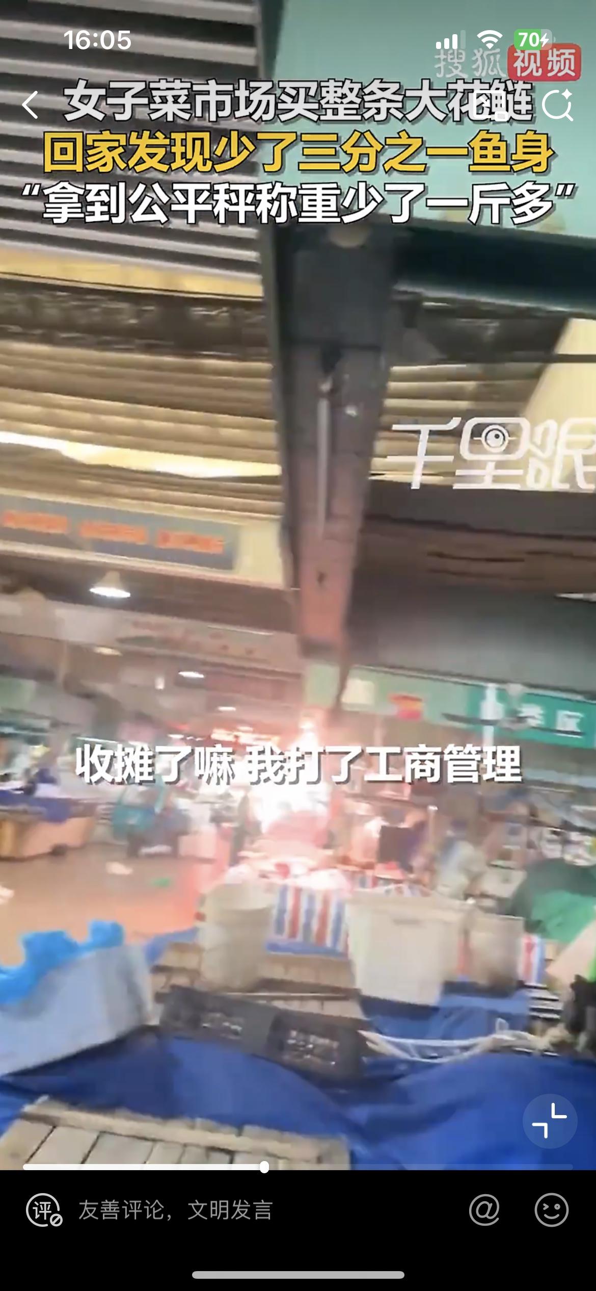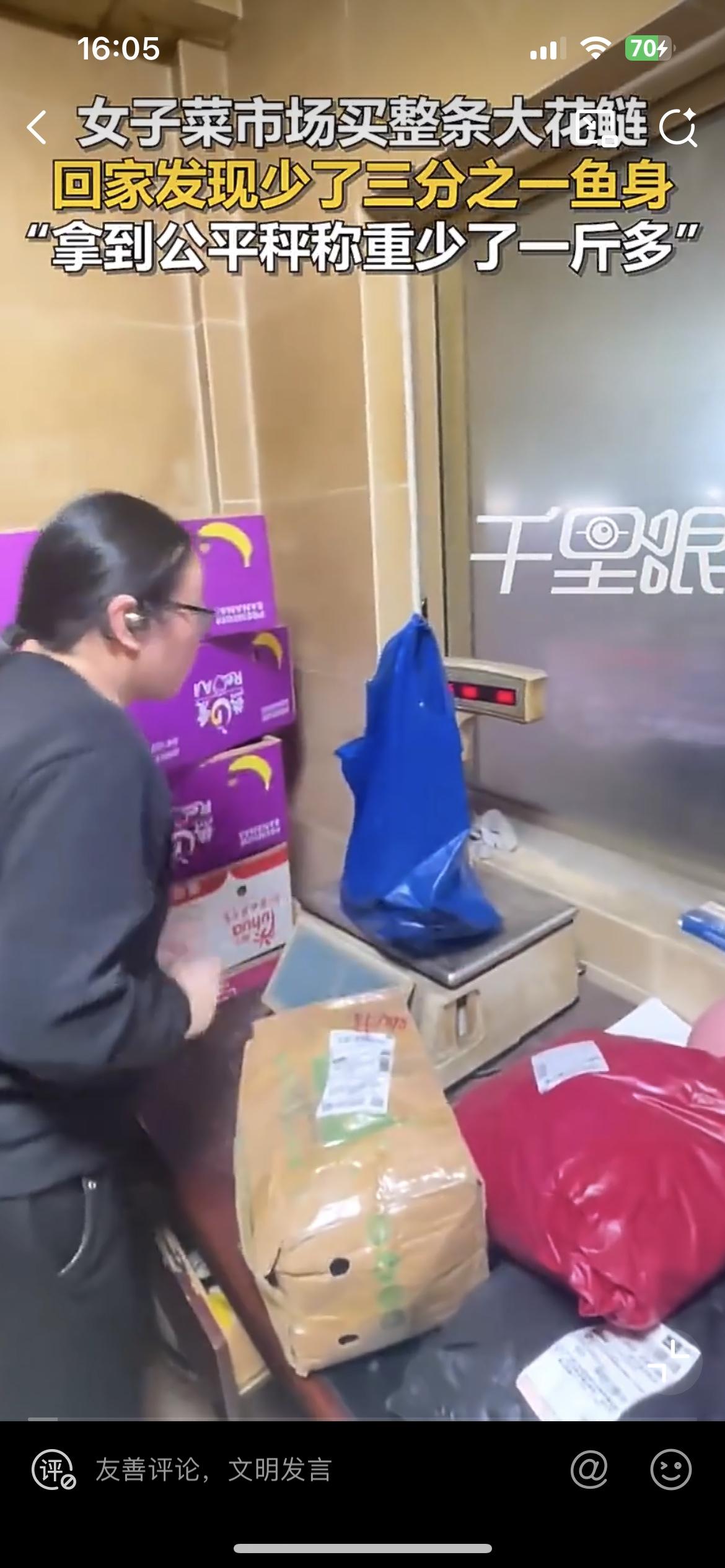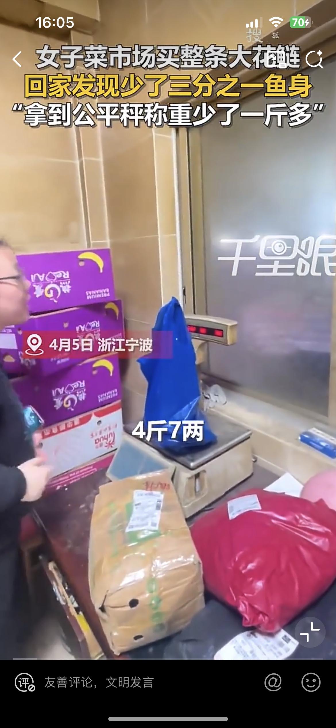 宁波女子菜市场遭遇杀鱼陷阱,一条 6 斤多重的花鲢竟然少了 1/3 的鱼身。4 月 5 日,这名女子在一菜市场买了一条鲜活的花鲢,12 块一斤,6 斤多,他给了 75 块钱。鱼贩给她当场宰杀,清洗干净以后,装袋拿回家。再次清洗的时候发现鱼身明显不对,他耐着性子把鱼身拼凑起来发现少了一大截。气愤不已的女子拿着鱼想去找鱼贩讨说法,没想到鱼贩已经提前开溜了。她把鱼拿到市场的公平秤复秤,发现只有四斤七两。向市场管理方投诉,没想到工作人员对鱼贩的姓名脱口而出,显然这名女鱼贩是一名惯犯,可能被消费者投诉多了。鱼贩搞秤的伎俩一般就是八两秤或者多喊秤,因为他杀鱼以后,基本上就很难复秤了。