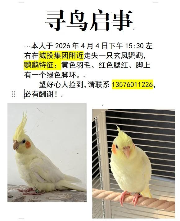 寻鸟启事 本人于2026年4月4日下午15:30左右在城投集团附近走失一只玄凤鹦鹉,鹦鹉特征:黄色羽毛、红色腮红、脚上有一个绿色脚环。 望好心人捡到,请联系 13576011226,必有酬谢!