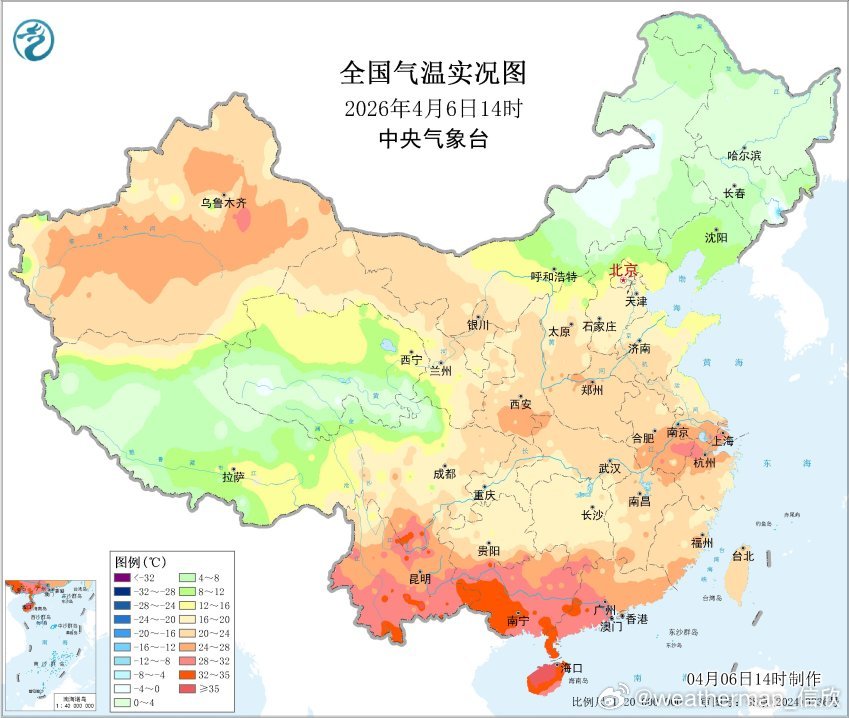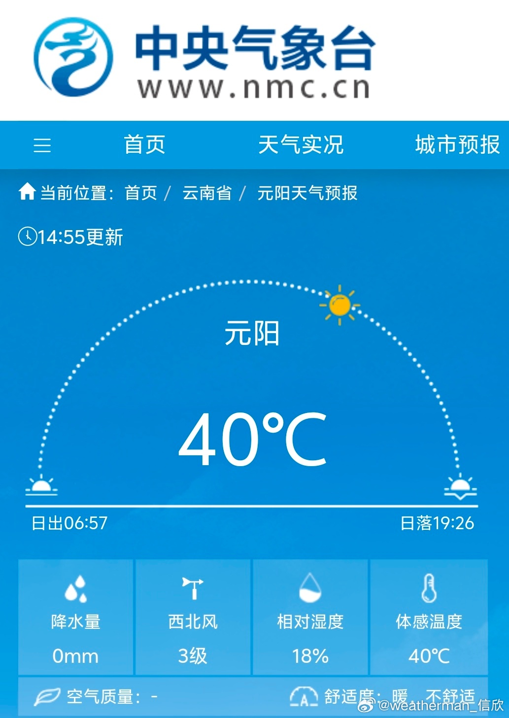 【南北气温差异大】今天下午我国南北气温差异大。云南元阳14点55分达到了40℃,为云南省今年首个达到40℃的国家气象站。而内蒙古的阿尔山同时次气温零下4.2℃。南北温差超44℃。