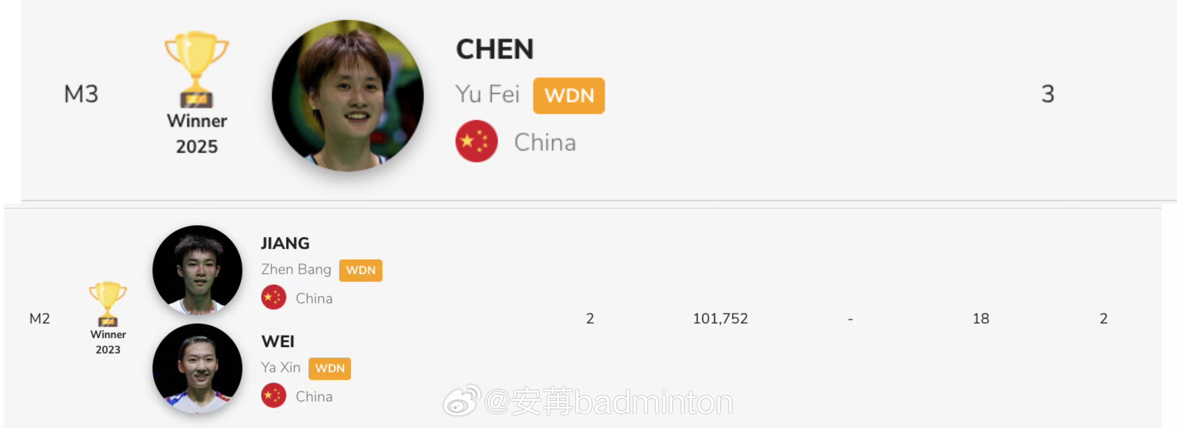 女单:陈雨菲🇨🇳男双:兰基雷迪/谢提🇮🇳女双:乔莉/葛雅特莉🇮🇳混双:蒋振邦/魏雅欣🇨🇳、鲁塔纳帕克/杰尼查🇹🇭