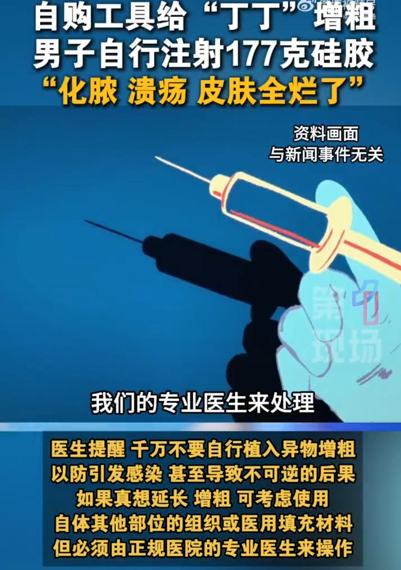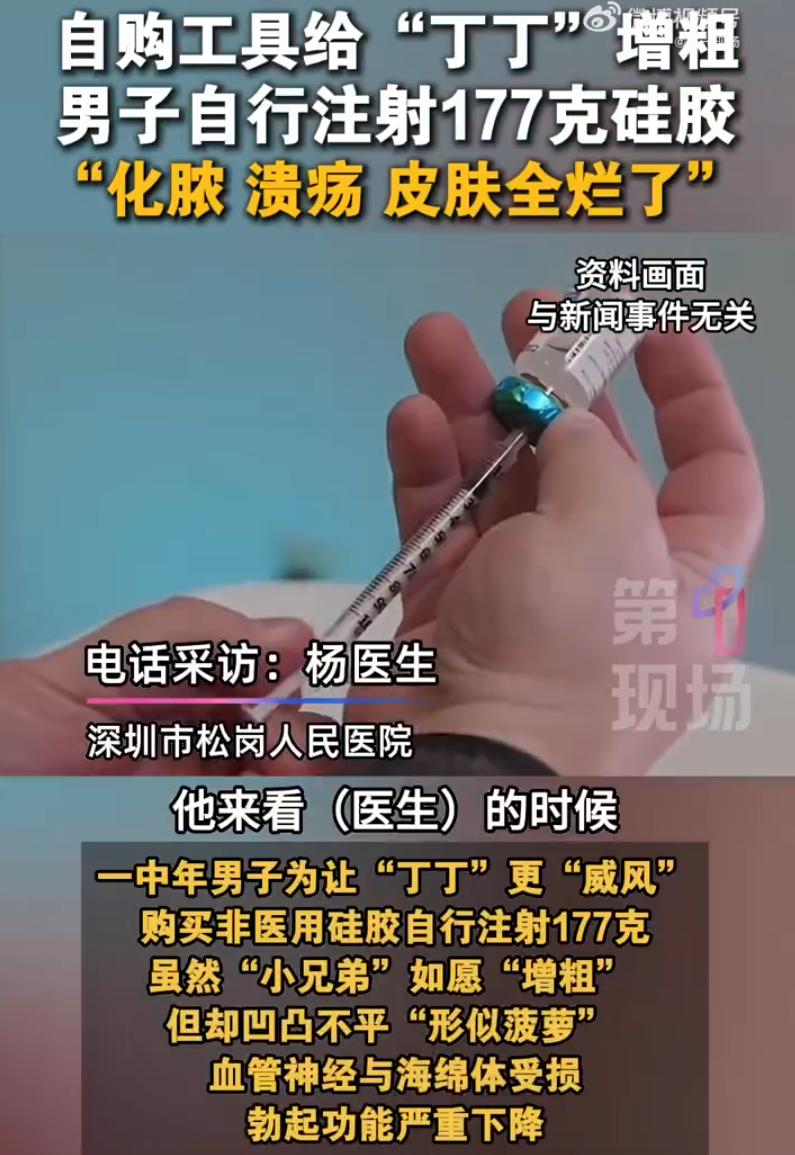 是个狠人!广东,一中年男子觉得自己现在年龄大了,房事上有些力不从心,于是心生一计,自购工具往丁丁上注射了177克硅胶,可大是大了,很快就出现了更严重的问题,最后只能去医院手术解决 房事上感觉力不从心,这本来是很多中年男人关起门来自己叹口气的事。但这哥们儿不甘心,琢磨来琢磨去,想了个“一劳永逸”的法子,既然不够大,那就让它变大 他也没去什么美容院、私立医院,直接自己上网,工具买齐,材料买好,硅胶到位。然后,自己动手,往丁丁里开打。这一打就是177克 这是什么概念?一瓶盒装牛奶大概250毫升,177克硅胶打进去,等于往那个地方塞了大半盒牛奶的容量。那地方本来就敏感脆弱,硬生生被撑大了好几圈 刚打完那会儿,效果确实“立竿见影”。大了,粗了,他心里估计还美了一阵,觉得自己的“聪明才智”没白费 但好景不长,几天之后就变味了 首先是形状不对了。硅胶不是均匀分布,这边鼓一块那边凹一块,整个看起来像菠萝一样疙疙瘩瘩。接着皮肤开始发红、发热,再然后化脓、溃烂,散发出一股腐臭味。他自己都能闻见,那味道甩都甩不掉 这下慌了。赶紧跑去深圳市松岗人民医院。接诊的杨医生打开一看,里面的组织已经一塌糊涂。手术做了,177克硅胶一块一块全掏了出来。但麻烦还没完,感染太严重,皮肤坏死了一大片,血管、神经、海绵体全被异物和炎症破坏得不成样子,后续还得植皮 万幸的是,基本勃起功能保住了。医生说,这已经是不幸中的万幸。如果再拖几天,或者感染再重一点,那就是永久性失去功能,谁也救不回来。 说句不好听的,这老哥是狠,但狠错了地方 很多人觉得身体哪块不满意,就想“自己动手丰衣足食”。网上教程多的是,材料随便买,工具随便挑,看上去门槛低得很。但身体不是乐高,不是你想加块砖就能加块砖的 真要觉得有问题,去正规医院,挂个泌尿外科或者男科,现在医学手段多的是,总之身体是自己的,千万不要拿自己来瞎做实验