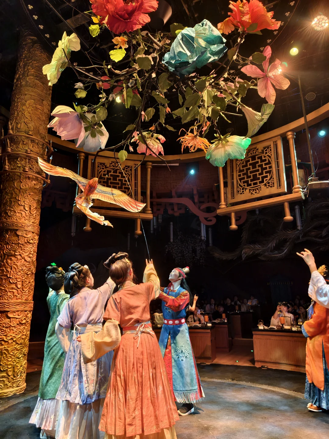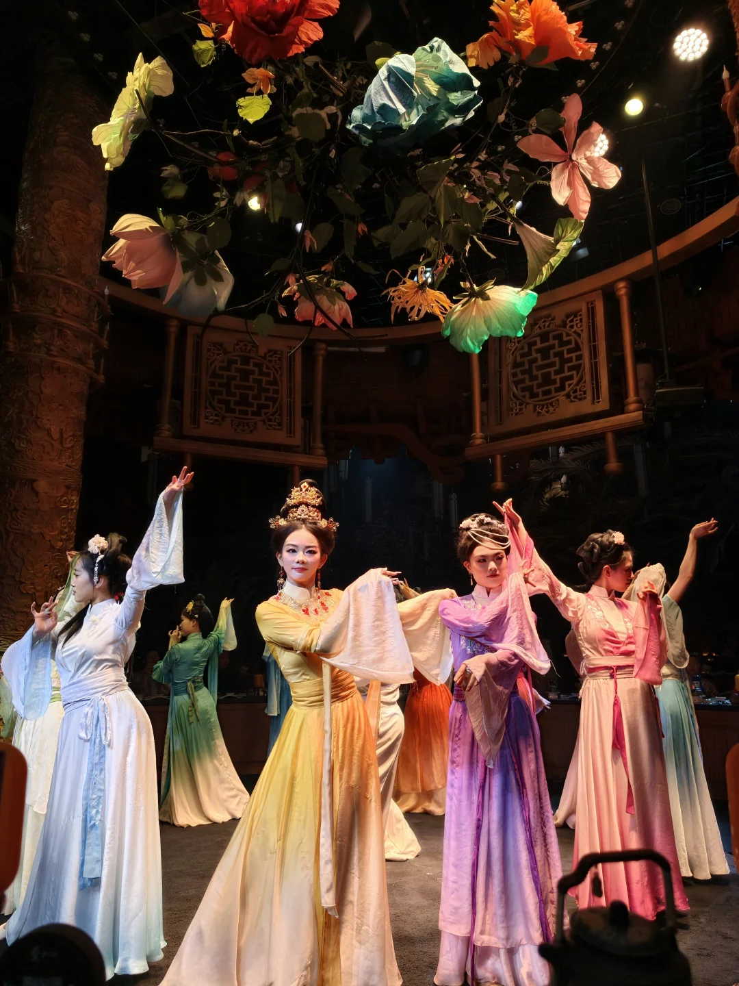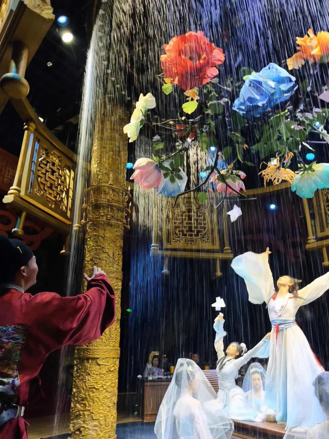 舞台很紧凑,但亮点很多:水幕、花瓣雨、投影都会出现,光影还会直接落在餐盘上讲解菜品来历。
