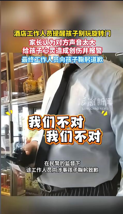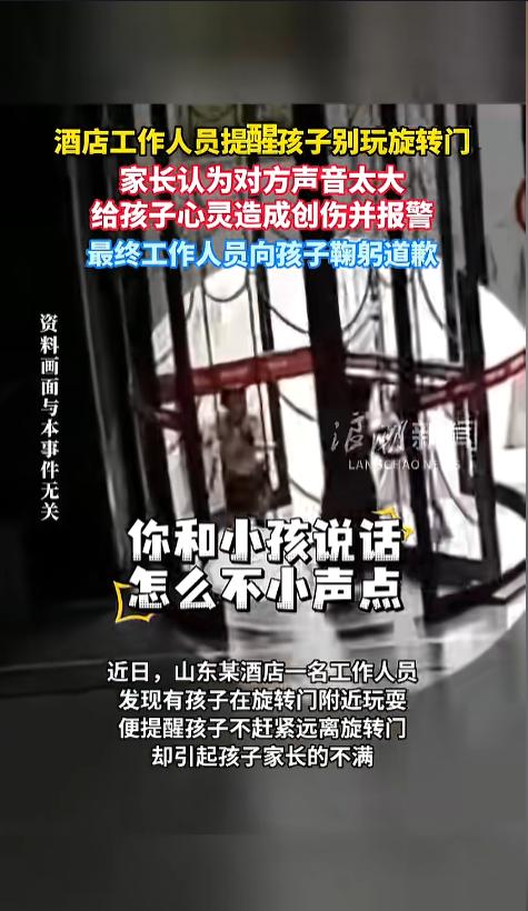 “没天理了!”近日,山东,几个孩子在酒店大堂玩旋转门,工作人员发现后,赶紧出声提醒。可孩子家长听后却不愿意了,非得说工作人员声音太大,吓着孩子了,最后还报了警,让人家鞠躬道歉。网友:以为孩子不懂事,原来是家长不懂事! 酒店大厅的旋转门,很容易引起小孩子的兴趣,有些小朋友就喜欢绕着她转,推着它走。其实,这是个很危险的举动,影响通行不说,更容易导致门出现故障,引起孩子的恐慌,甚至被门夹伤。 据媒体4月5日报道,事发当天,酒店大堂内,几个孩子正在旋转门里跑来跑去,一旦摔跤就可能被卡住,非常的不安全。工作人员看见后,赶紧提醒,“小朋友不能这么玩,小朋友快出来!” 可没想到,一旁孩子的家长却不愿意了,嘴里吵吵着,“你和小孩说话怎么不小声点,你吓着孩子怎么办!”工作人员赶紧解释,孩子们这么玩容易受伤,他这是为了提醒孩子。 其实,工作人员的声音并不大,跟家长的声音比起来简直小巫见大巫了。工作人员连忙口称不对,家长还是不依不饶,最后对方甚至还报了警。在警察的见证下,工作人员给孩子鞠躬道歉。 网友看后表示,这个世界太癫了,好心被当驴肝肺啊!难不成等孩子出事了,再去后悔!这要是我的孩子,我巴不得人家声音再大点,还得好好谢谢人家!真正该道歉的,是孩子和家长! 信息来源:《酒店工作人员提醒孩子别玩旋转门,家长认为对方声音太大,给孩子心灵造成创伤并报警,最终工作人员向孩子鞠躬道歉》浪潮新闻
