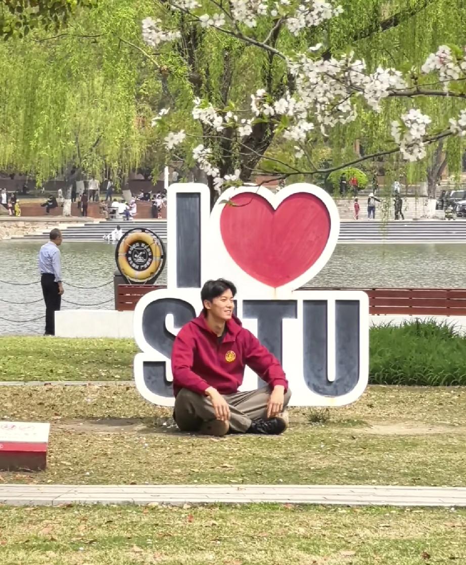 汪顺参加完上海交大校庆后,独自坐在草地上,笑得像个小孩。 4月6日上午,汪顺现