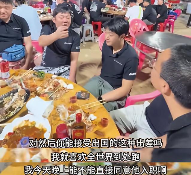 一小伙为追张雪,追到他们公司在海南的饭桌上, 想直接“boss直聘”,张雪看小伙身上的衣服, 果断把这场饭桌应聘答应下来了。 张雪把每年公司的团建都安排骑行旅游,全公司的骨干,都穿上黑色工服,骑上张雪机车到处旅游,既是宣传,也是企业文化。 今年头的骑行旅游,张雪和骨干们就来到海南,本来想用一顿海南的海鲜大餐结束这一天,谁知道有个崇拜张雪的小伙,大胆地跟着张雪团队后头,最后和他们一桌吃饭,并提出一个过分的要求。 小伙说想应聘张雪公司,张雪表面上想把问题甩给同桌的HR,缓解一下尴尬,但转眼看到小伙的一身衣服就眼睛发光了。 张雪看到小伙竟然穿着张雪机车的工服,还不止如此,工服还穿得起毛球了,这证明小伙这身工服并不是一时的表演而穿的,相反,这小伙更像一个崇拜张雪已久的粉丝,加上小伙在饭桌上的谈吐和外语应届生条件,张雪瞬间觉得这个小伙未来可期。 之后张雪的接话,就像公司的二面程序: “你能接受未来全世界到处跑出差吗?” 小伙的果断更让人刮目相看: “我就喜欢全世界到处跑” 也许是小伙的讲话高情商,但从现场的反应来看,小伙更像是真正热爱机车,认可张雪本人的粉丝,没有套路,没有剧本,像极了张雪当年厚着脸皮求着记着报道的模样,可能这也是张雪一眼相中小伙的原因之一。 张雪的回应也是果断,立刻他就把压力给到HR,把最后的面子留给真正管人事的: “我今天晚上能不能直接同意他入职啊?” 张雪表面上是询问,实际上也是肯定了这小伙的应聘,HR也是毫无疑问地说没问题了。 最后张雪也为这次机缘巧合的应聘干杯,也为得到新兵而喝上一杯。 身边的一个人调笑到:“这真的是boss直聘啊”