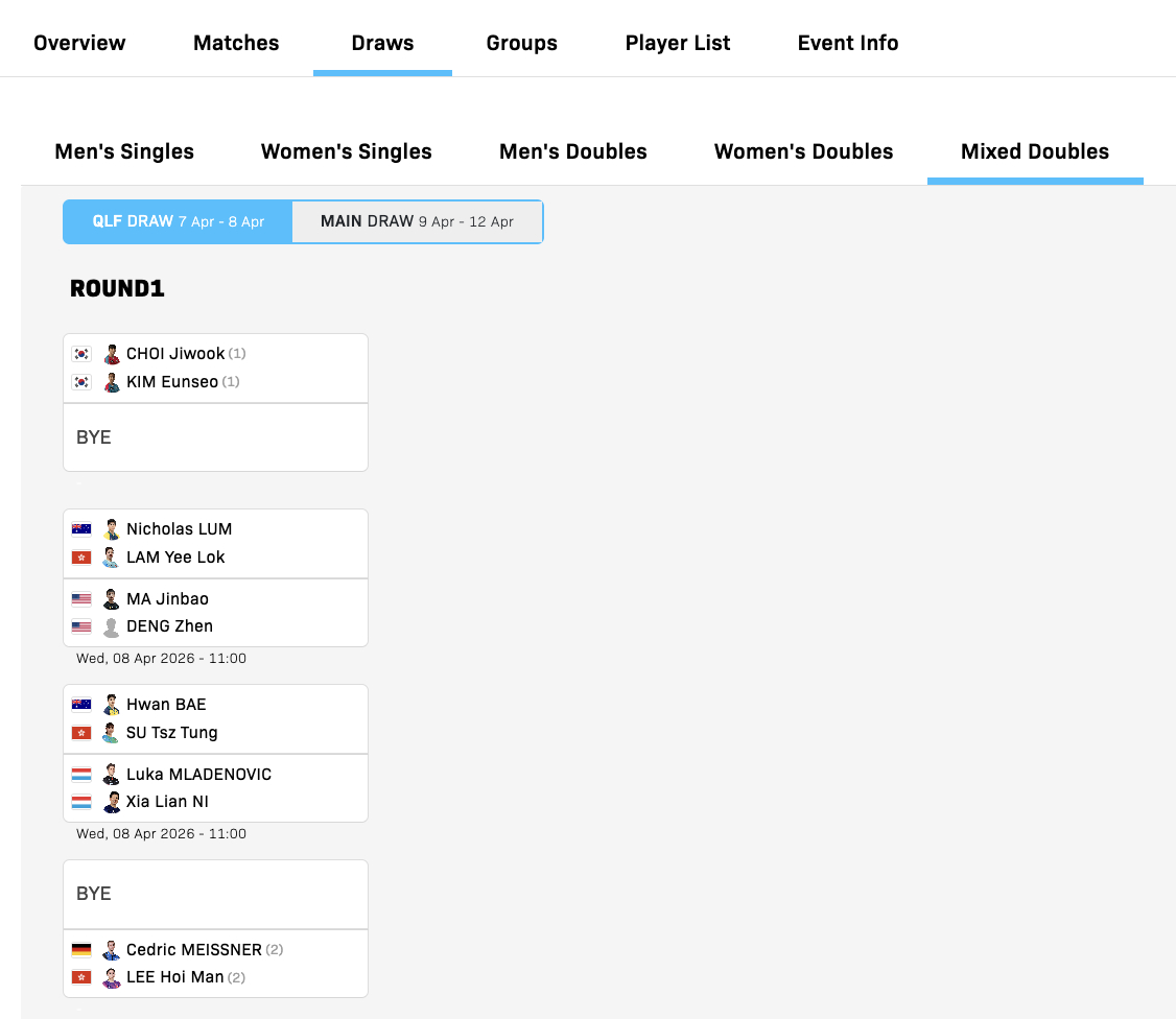 WTT常规挑战赛太原站丨混双资格赛签表【1/4区】崔志煜/金恩胥🇰🇷直接晋级正赛【2/4区】林文政🇦🇺/林依诺🇭🇰VS马金宝/邓真🇺🇸【3/4区】裴焕🇦🇺/苏籽童🇭🇰VS姆拉德诺维奇/倪夏莲🇱🇺【4/4区】迈斯纳🇩🇪/李凯敏🇭🇰直接晋级正赛
