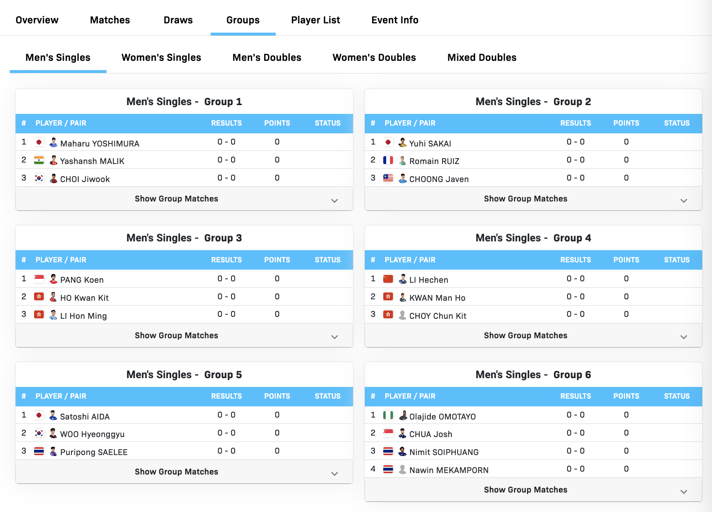 WTT常规挑战赛太原站丨男单资格赛分组【Group 1】吉村真晴 🇯🇵、亚沙什·马利克🇮🇳、崔志煜🇰🇷【Group 2】坂井雄飞🇯🇵、罗曼·鲁伊斯🇫🇷、钟子毅🇲🇾【Group 3】冯耀恩🇸🇬、何钧杰🇭🇰、李汉铭🇭🇰【Group 4】李和宸🇨🇳、关文皓🇭🇰、蔡俊杰🇭🇰【Group 5】英田理志🇯🇵、禹衡圭🇰🇷、普里蓬·萨利🇹🇭【Group 6】奥拉吉德·奥莫塔约🇳🇬、蔡劭恒🇸🇬、尼米特·索伊普豪🇹🇭、纳温·梅坎蓬🇹🇭