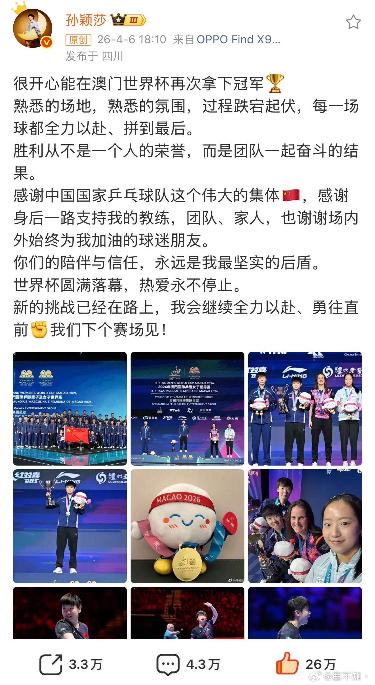 孙颖莎长文总结世界杯恭喜莎莎成为乒乓球历史上首位在【不限二】【各协会满员参赛】【升国旗】【含金量最高】的世界杯达成三连冠🏆🏆🏆的运动员!!在感谢团队同时也要感谢你,在最困难的时候也没有放弃的你,感谢清晨五六点的太阳 晚上十点多的月光以及你 一颗渴望胜利勇于承担的赤子之心!希望你永远快乐打球,勇敢追求自己所爱,梦想不灭!追梦不止!