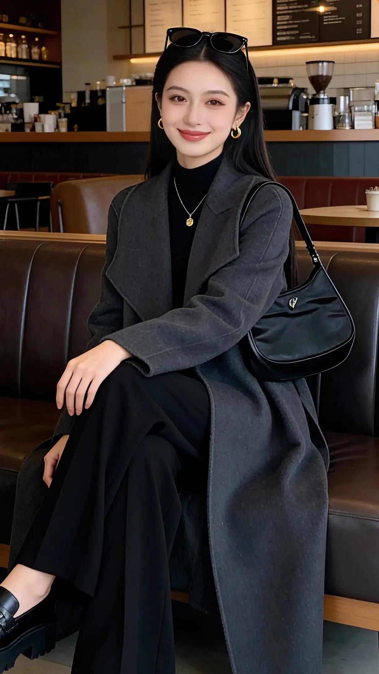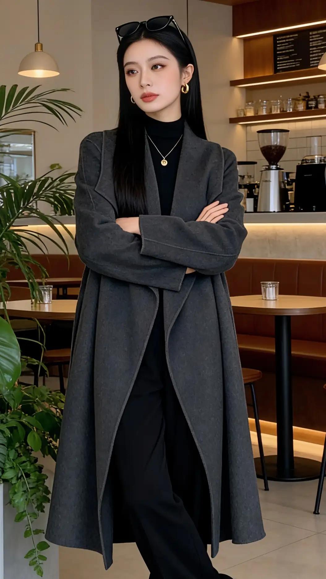 女生如何穿搭看起来时尚更有品味呢黑色的长发,淡妆,灰色的长款大衣,看着非常有时尚潮流品味。
