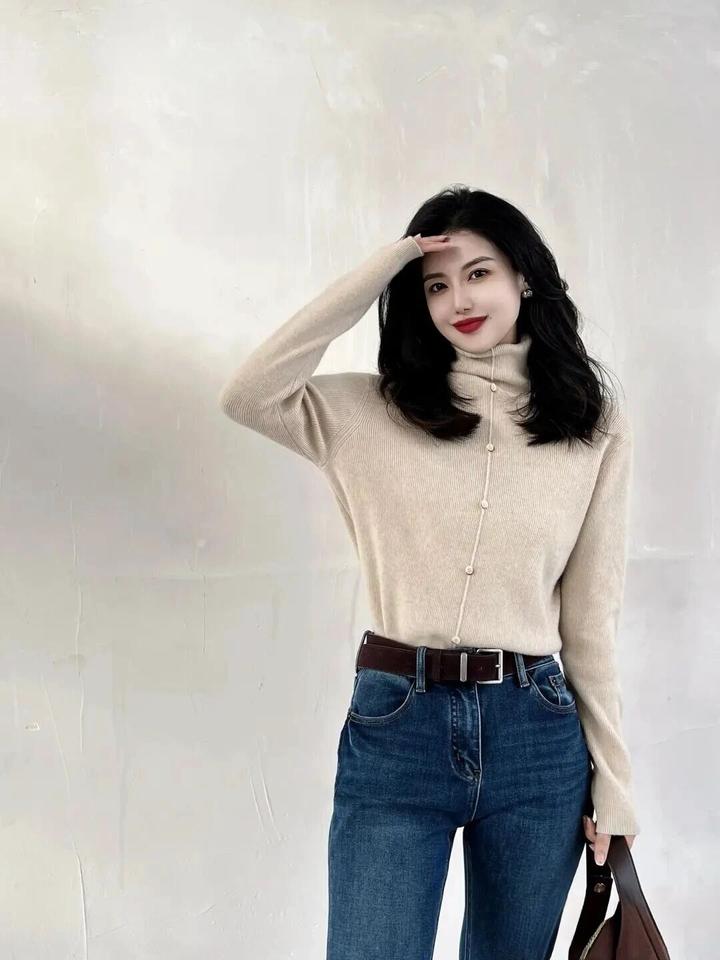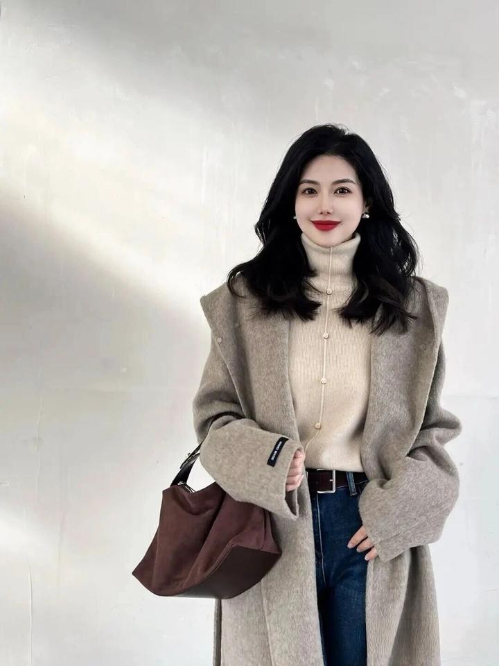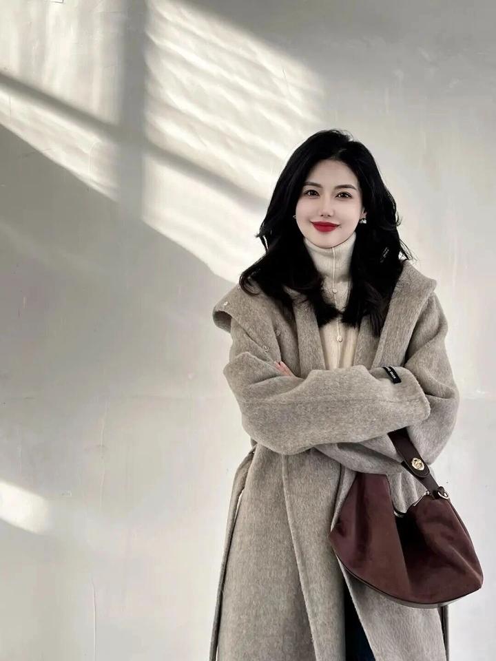 女生如何穿搭看起来时尚更有品味呢黑色的长发,淡妆,灰色的长款大衣,看着非常有时尚