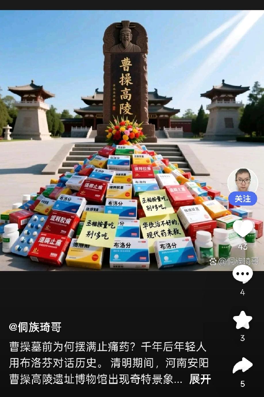 特殊祭品寄深情 近日,有网友在清明节期间前往位于湖北荆门的张居正墓祭扫,并留下了马应龙痔疮膏作为特殊祭品,这一行为源于野史中关于张居正因痔疮手术元气大伤而逝世的记载。 2026年4月5日,有来自河北邯郸的网友专程前往中国湖北省荆门市的张居正墓进行祭拜。除了常规祭品,该网友还特意供奉了马应龙痔疮膏和一只小白龟,以一种颇具创意的方式表达对这位历史人物的纪念。 此举并非恶搞,而是基于一段野史记载。据传,明朝内阁首辅张居正晚年患有严重的痔疮,并因此接受了一次手术,术后元气大伤,这被认为是导致其最终逝世的原因之一。网友选择送上痔疮膏,意在以一种跨越时空的幽默与关怀,回应历史人物的这一“痛点”。 与此同时,在曹操墓前,则出现了布洛芬等药品,对了,曹操生前患有偏头痛的顽疾,而布洛芬则是现代缓解疼痛的良药。那么曹操墓前所出现的布洛芬等祭品就不言而喻了。 而令人更感动的则是海空卫士王伟烈士雕像前出现的大量中国海空军五代机、六代机及航母模型。它正在告慰烈士,您当年所驾驶的81192歼8Ⅱ战机如今已更新换代为具有当今世界最高水平的歼20、歼35、歼36、歼50等五代、六代机,您当年驾驶国产新型战机在国产航母起降的夙愿已经美梦成真! 而与此同时,在遥远的英伦三岛,中国驻英总领事为北洋水师水兵扫墓,墓前的祭品则是中国航母山东舰的模型。它也在告慰中日甲午战争中牺牲的北洋水师的官兵,当年英勇作战的致远等铁甲舰,如今已变成了国产航母等先进战舰,中华民族已进入了三航母时代,列强欺负旧中国的历史一去不复返了! 这真是:特殊祭品寄深情,而今迈步向前行!