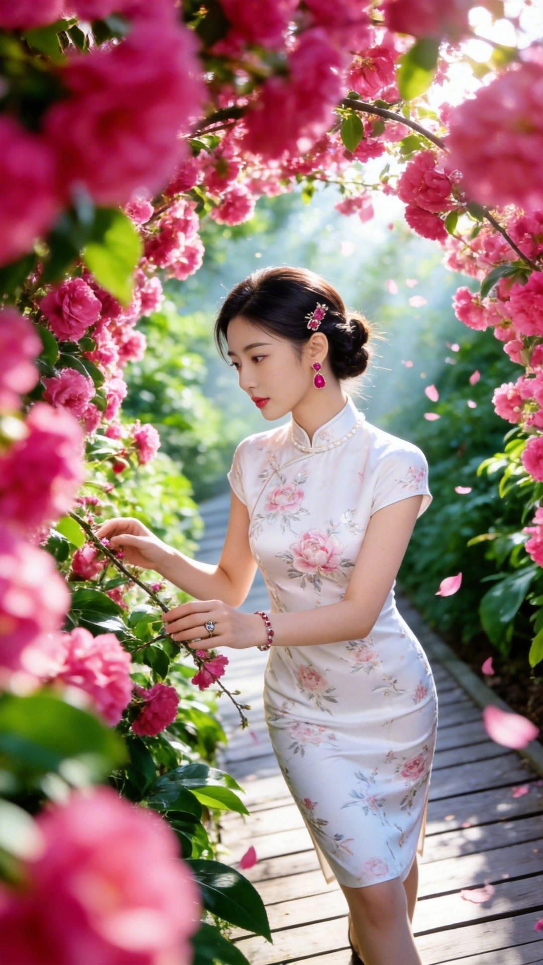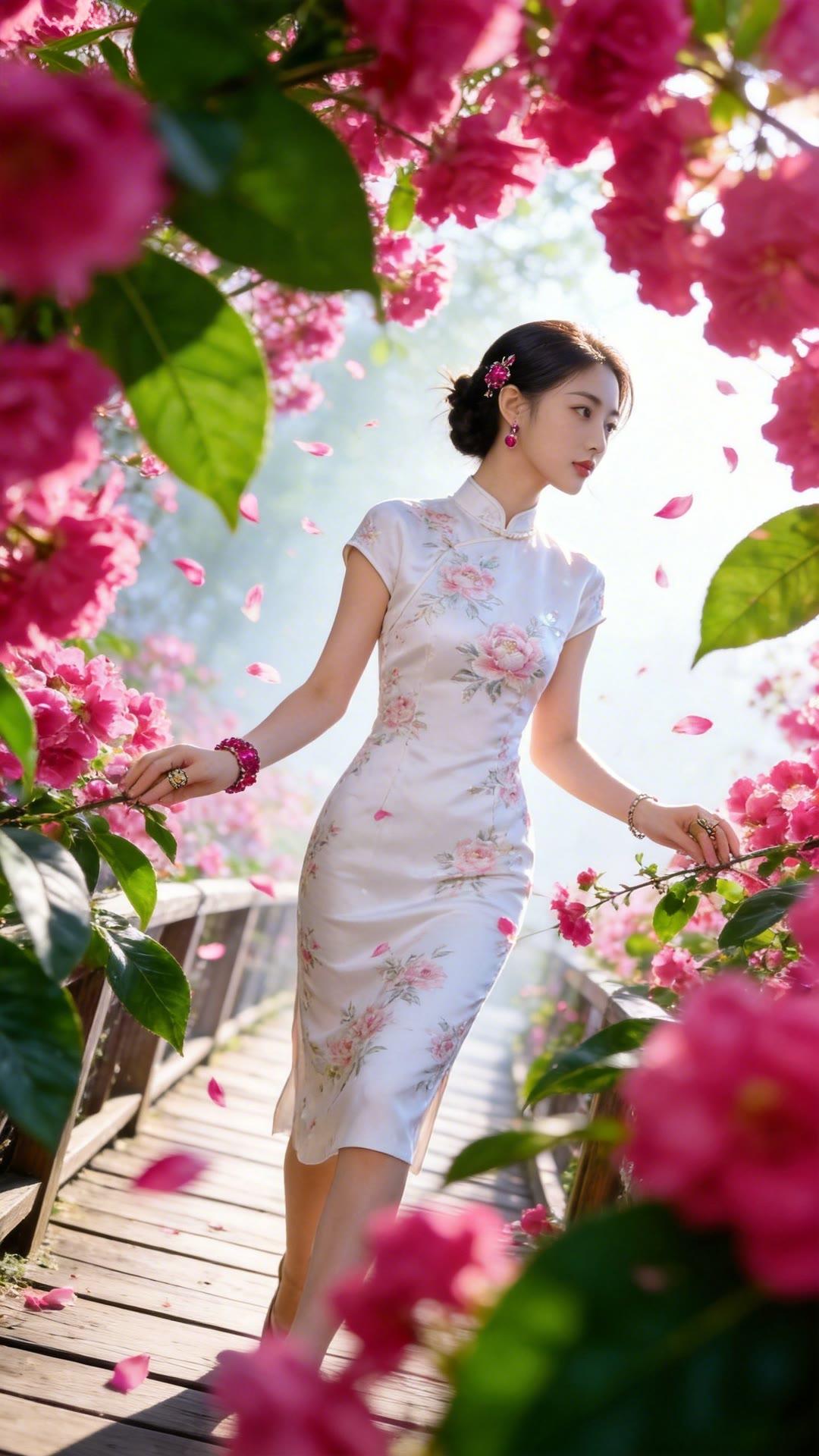 优雅旗袍,花间仙子,粉黛如画。