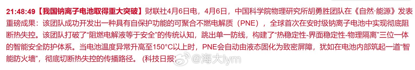 4月6日,中国科学院物理研究所胡勇胜团队在《自然·能源》发表重磅成果:该团队成功开发出一种具有自保护功能的可聚合不燃电解质(PNE),全球首次在安时级钠离子电池中实现彻底阻断热失控。该团队打破了“阻燃电解液等于安全”的传统认知,跳出单一防线,构建了“热稳定性-界面稳定性-物理隔离”三位一体的智能安全防护体系。当电池温度异常升高至150°C以上时,PNE会自动由液态固化为致密屏障,犹如在电池内部筑起一道“智能防火墙”,彻底切断热失控的传播路径。 (科技日报)