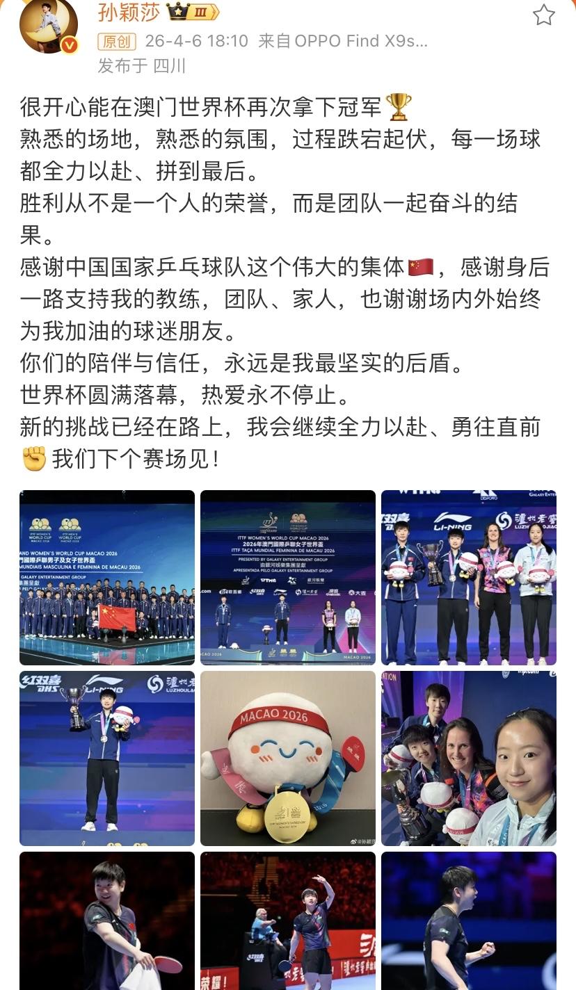 孙颖莎不但回到了四川, 还说新的挑战已经在路上, 热爱永不停止。 孙颖莎更新社交平台动态, 开心的事情, 再次拿到了世界杯冠军, 这可是连续三次冠军。 胜利属于整个集团, 从不是一个人的荣誉。 莎莎是有大格局的人, 每一次总结到位, 令人产生共鸣。 世乒赛要来临, 她都会全力以赴, 勇往直前! 我会继续陪伴莎莎, 一直为她加油!