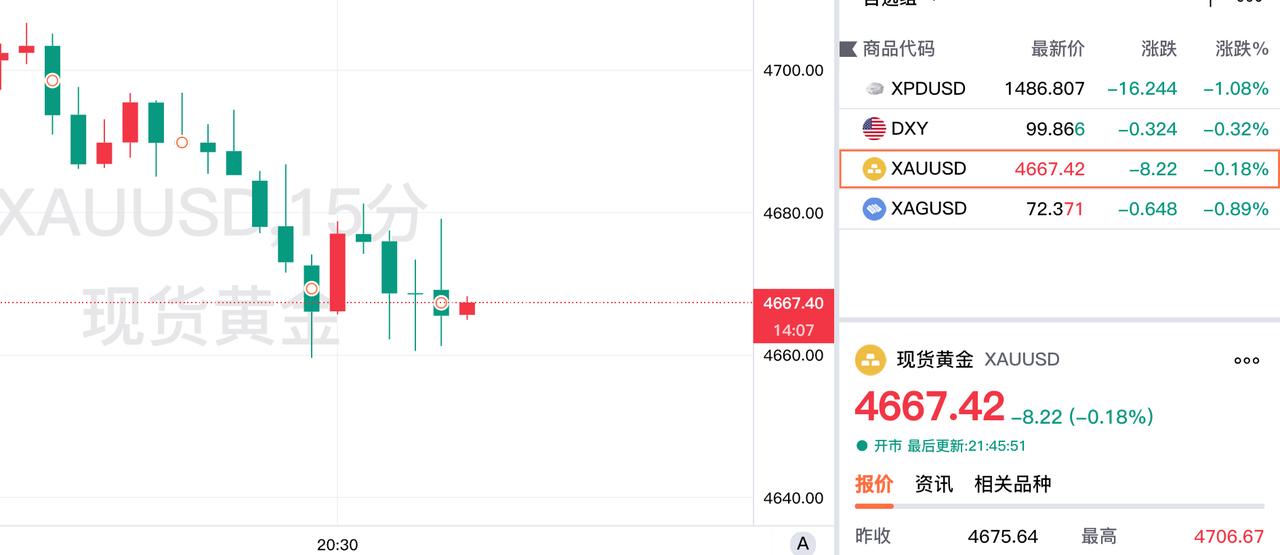 黄金和白银是否还有上涨空间呢? 现货黄金再度 上演冲高回落的老戏码。 虽然现货黄金一度上攻4700美元, 但是再度回落。 现在现货黄金报价4667.42美元, 较上一日下跌8.22美金。 对于后市, 期货小褚认为金价有望再度上涨!