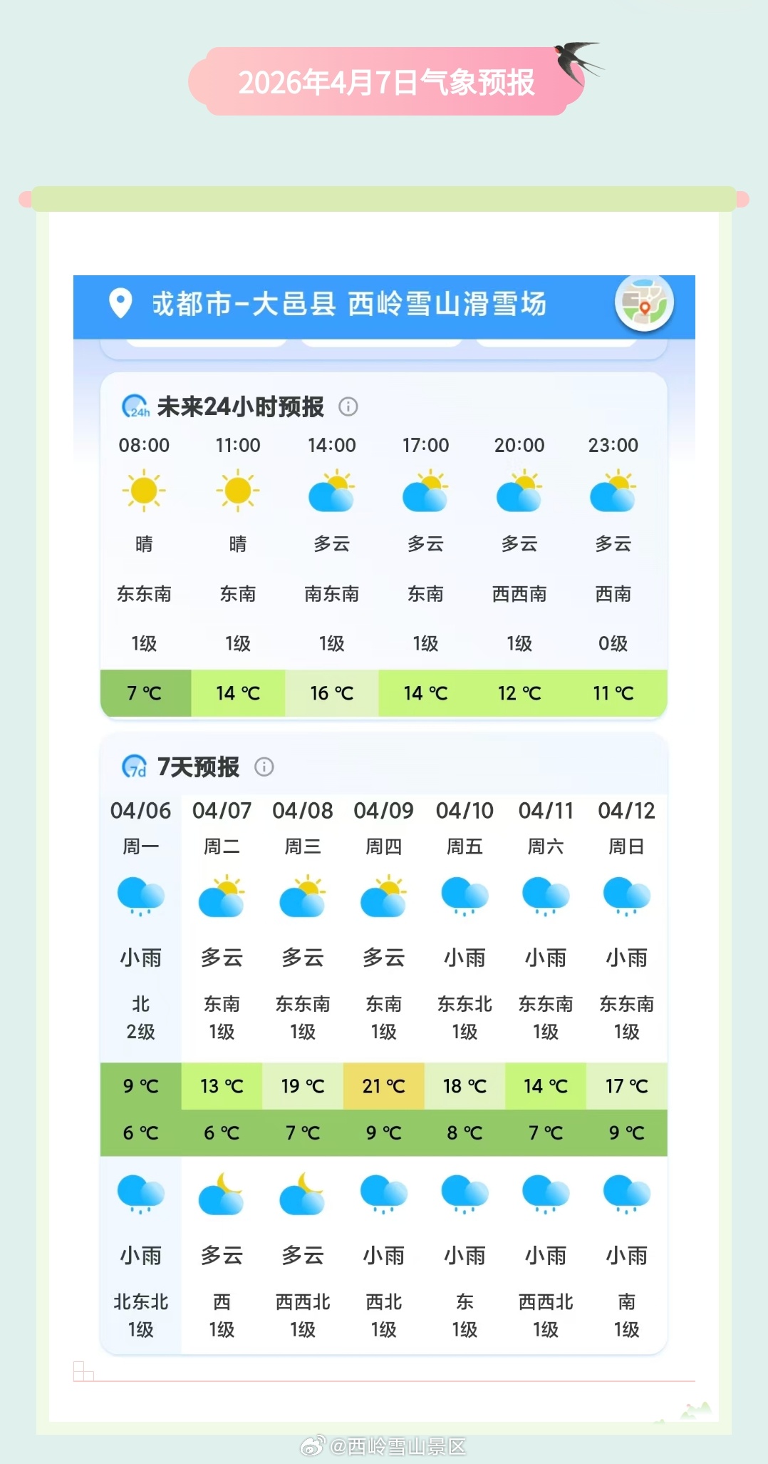 西岭雪山4月7日(周二)气象预报#西岭雪山#