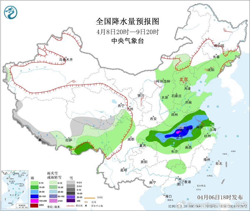 预计4月8日20时至9日20时,西藏东北部和西南部、青海南部等地有小雪或雨夹雪,其中,西藏西南部部分地区有中到大雪,局地暴雪(10~15毫米)。重庆北部、湖南北部、江西北部、湖北大部、河南南部、安徽、江苏、西藏东南部等地部分地区有中到大雨,其中,湖北东北部、安徽西部、河南南部局地有暴雨到大暴雨(50~105毫米)。