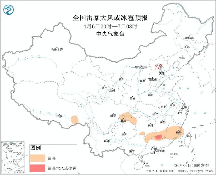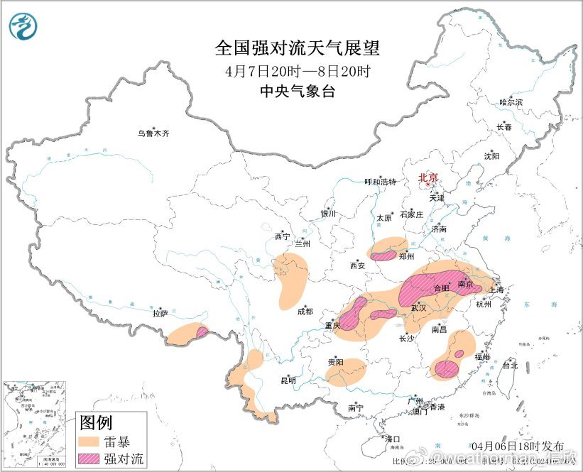 预计4月7日20时至8日20时,西藏东南部、河南东南部和西部、重庆中东部、湖北南部和东北部、安徽中部、江苏西南部、江西东南部、福建西南部等地的部分地区将有强对流天气。