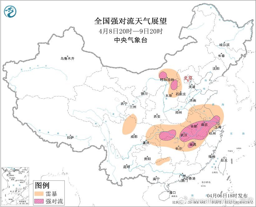 预计4月8日20时至9日20时,内蒙古中部、山西北部、湖北东部和西南部、安徽中南部、江苏南部、江西北部、浙江西部等地的部分地区将有强对流天气。