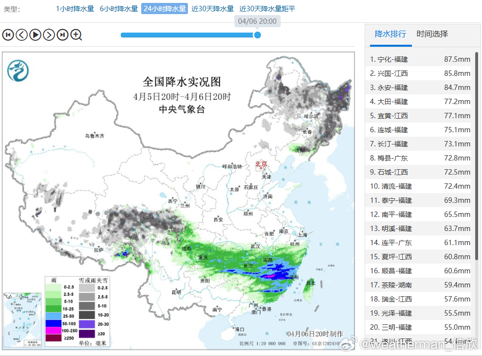 4月6日20时至7日20时,黑龙江东部、吉林东部、西藏北部和东部、青海中南部、川西高原北部等地部分地区有小到中雪或雨夹雪,其中,青海中部等地局地大雪(5~8毫米);西藏东南部、江西南部、福建中南部和台湾岛西北部等地的部分地区有大到暴雨(50~90毫米)。