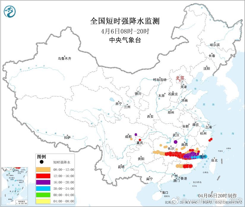 预计4月6日20时至7日20时,湖南东南部、江西南部、福建中南部、广东东北部等地的部分地区将有短时强降水天气,小时雨量20-40毫米,局地可达50毫米以上;另外,湖南东南部、江西南部、福建东南部等地的局地将有雷暴大风或冰雹天气。