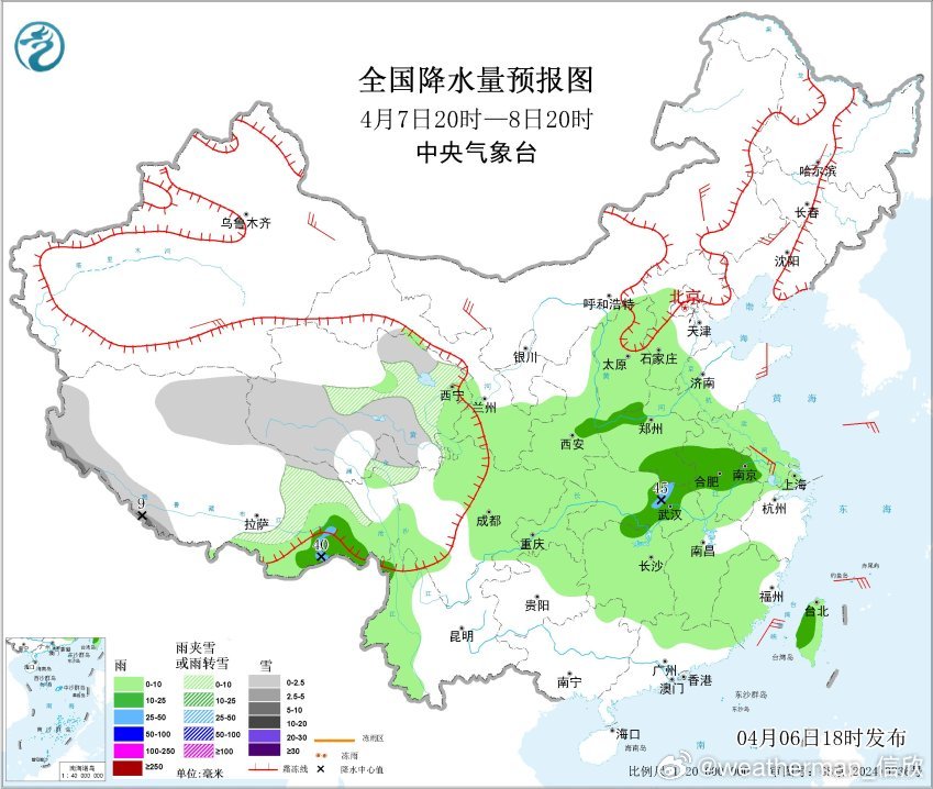 预计4月7日20时至8日20时,青海南部、西藏西南部和东北部等地有小雪或雨夹雪,其中,西藏西南部部分地区有中到大雪。湖北中部、河南南部和西北部、山西南部、陕西东部、安徽中部、江苏西南部、西藏东南部、台湾岛西部等地部分地区有中到大雨。