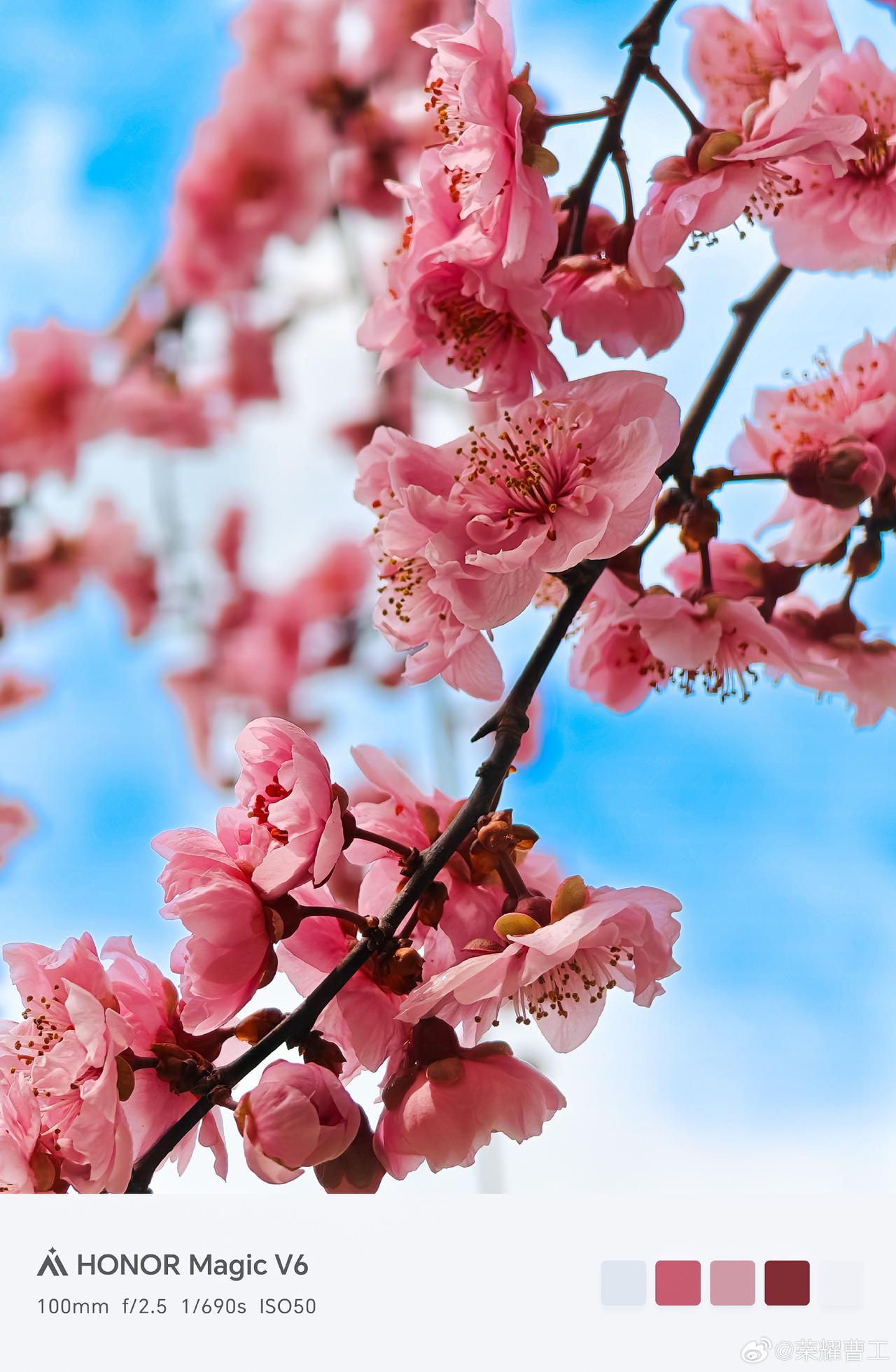 春天到处是花的海洋,那么如何来将美好的瞬间留住呢?利用手机随手拍的方式无疑是最佳的选择,刚刚看到荣耀研发工程师曹工,分享了一张利用荣耀Magic V6长焦镜头,使用仰拍视角以蓝天白云为背景的花卉照片,完美捕捉了春日花开的治愈感。畅聊数码新品 数码资讯