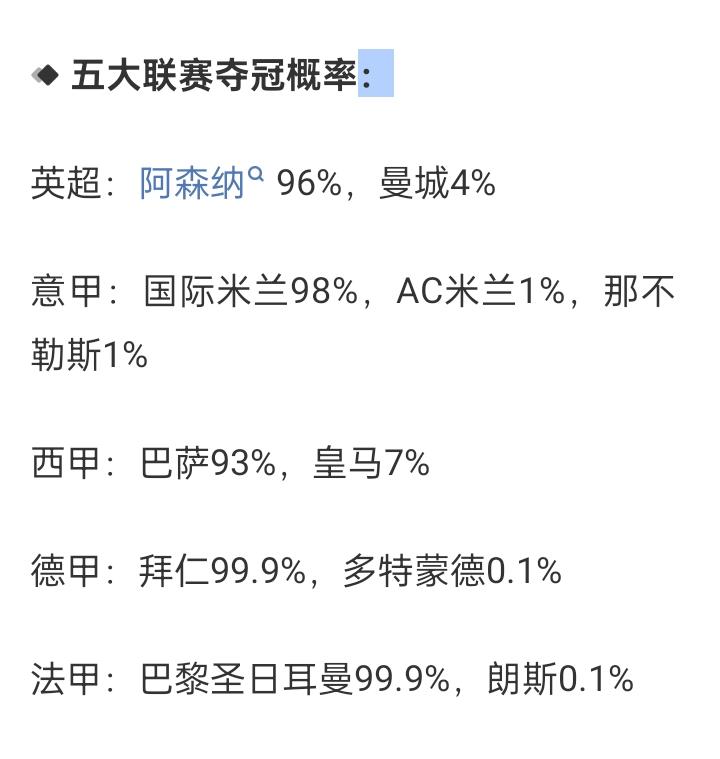 五大联赛夺冠概率:拜仁99.9%,巴黎99.9%,国米98%,阿森纳96%,巴萨93% 04月06日 欧洲五大联赛已经快接近尾声,数据网站Football Rankings列出了各联赛球队夺冠概率,五大联赛领头羊夺冠概率均超过了90%,其中拜仁、巴黎99%最高,国米98%,阿森纳96%,巴萨93%
