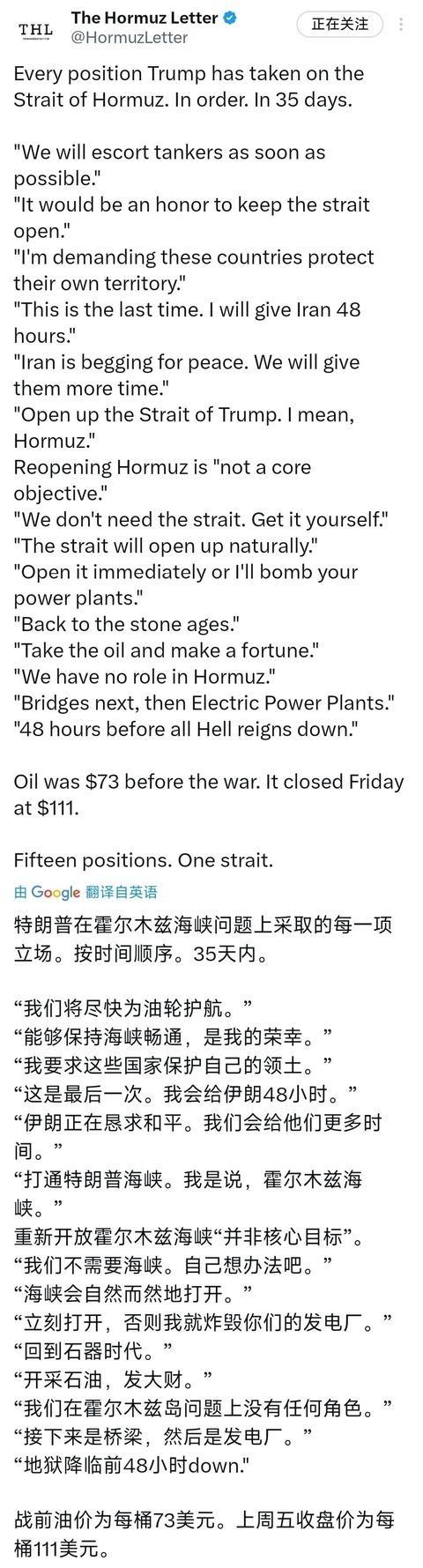 一夜醒来,特朗普又连发三文!一,特朗普发文写道:按35天来的先后顺序:“我们会尽快护送油轮。能保障海峡畅通是我的荣幸。我要求这些国家保护好自己的领土。这是最后一次。我给伊朗 48 小时。伊朗在求和。我们会再给他们一些时间。打开特朗海峡。我是说,霍尔木兹海峡。重新开放霍尔木兹海峡并非核心目标。 日前特朗普在Truth Social上连着发了三条帖文,内容主要盯着中东那边的霍尔木兹海峡和伊朗局势。这条海峡本来是全球石油运输的大动脉,每天差不多有五分之一的石油和天然气从这里经过,结果因为美国和以色列跟伊朗的冲突,从2月底开始就基本被堵住了。伊朗那边用无人机、小型船只和导弹威胁,搞得很多油轮不敢走,通行量从以前一天一百多艘掉到十几艘甚至更少,全球油价跟着波动,不少船公司直接绕道非洲南端,成本一下子就上去了。 特朗普在第一条帖文里,按过去35天的事情顺序讲,先说美国会尽快护送油轮通过,还提到保障海峡畅通是他的责任。他要求那些国家自己管好领土安全,说这是最后一次提醒。然后直接给伊朗48小时期限,指出伊朗那边有求和的迹象,美国会再多给点时间处理。他中间还把海峡名字说成“特朗海峡”,马上改口成霍尔木兹海峡,强调重新开放这个海峡不是美国最主要的目标,美国对这条通道没那么依赖,让其他国家自己想办法,海峡可能会自然通畅起来。帖文后面口气变硬,说如果不马上行动,美国就要针对发电厂这些设施下手,让对方回到基础状态,还提到会把石油拿走发财,美国在海峡里没啥直接角色,接下来可能轮到桥梁,48小时后一切会很糟糕。 第二条帖文在北京时间4月5日发出来,特朗普说伊朗不少军事领导人因为指挥和决策的问题,在行动中被清除。他提到针对德黑兰的大规模袭击还带来其他后果,并且附上了一段美军行动的视频。视频里能看到夜间爆炸的画面,火光和烟柱升起,显示出打击的强度。 第三条帖文则是直接点名《纽约时报》,特朗普说这家报纸正在走下坡路,用假新闻反复攻击他这个总统,结果发行量掉得很厉害。他指出报纸把北约写成了“北美条约组织”,正确的名字是北大西洋条约组织,这个错误挺有意思的。他还说报纸的招聘水平和教育标准下滑严重,最后呼吁把“所有值得印刷的新闻”还回来,让美国再次强大。 霍尔木兹海峡的堵塞已经持续好几周,伊朗控制着狭窄的水道,威胁任何试图通过的船只,导致石油运输受阻,影响了不少依赖进口能源的国家。特朗普之前给过伊朗10天时间谈判或开放海峡,后来又延长过,中间还提到伊朗有派油轮作为善意姿态,但整体上双方都没松口。帖文里提到的48小时期限指向4月6日左右,重点在发电厂和桥梁这些基础设施上,美国军方之前已经对德黑兰周边目标动手,还救回了被击落的飞行员。 从实际情况看,海峡通行量远没有恢复正常。联合海上信息中心的数据显示,最近几天只有少数船只冒险通过,大部分船还在观望。全球能源市场因为这个原因一直不太稳,油价受影响,供应链也跟着紧张。伊朗那边回应说会保护自己的利益,同时允许部分国家的船只通过作为调整。美国这边则继续联合以色列行动,针对伊朗的目标进行打击,双方到现在还没达成停火。 特朗普发帖的风格一贯直接,这次又用了比较强的措辞,国际媒体都报道了,包括纽约时报自己也对北约名称错误发了更正说明。帖文提到伊朗军事领导人被清除的部分,配了视频,显示出美军打击的实际效果,但也让局势显得更复杂。整个事件牵扯到石油安全、地区稳定和全球贸易,大家都在看接下来几天会怎么发展,尤其是那个最后期限过去之后。 目前冲突还在继续,海峡的堵塞让不少国家感受到压力,美国国内也有声音讨论护航油轮的成本和风险。特朗普通过社交平台持续表达立场,强调美国不需要完全依赖这条海峡,但同时警告行动会很严厉。伊朗官方则坚持自己的立场,没有完全让步。国际社会有一些外交努力,想推动谈判,但到现在效果有限。油轮护送的问题提到过,美国说会尽快安排,其他国家也被要求自己负责领土防护。