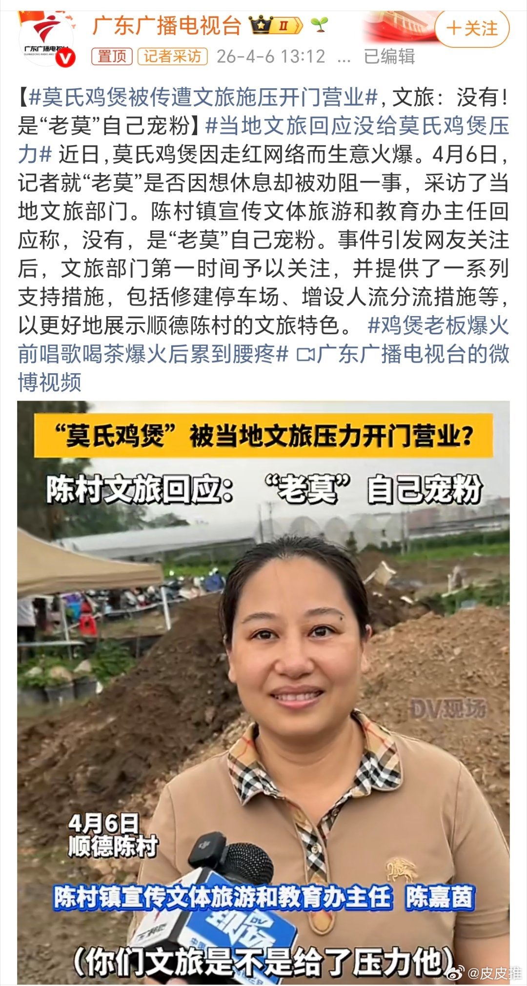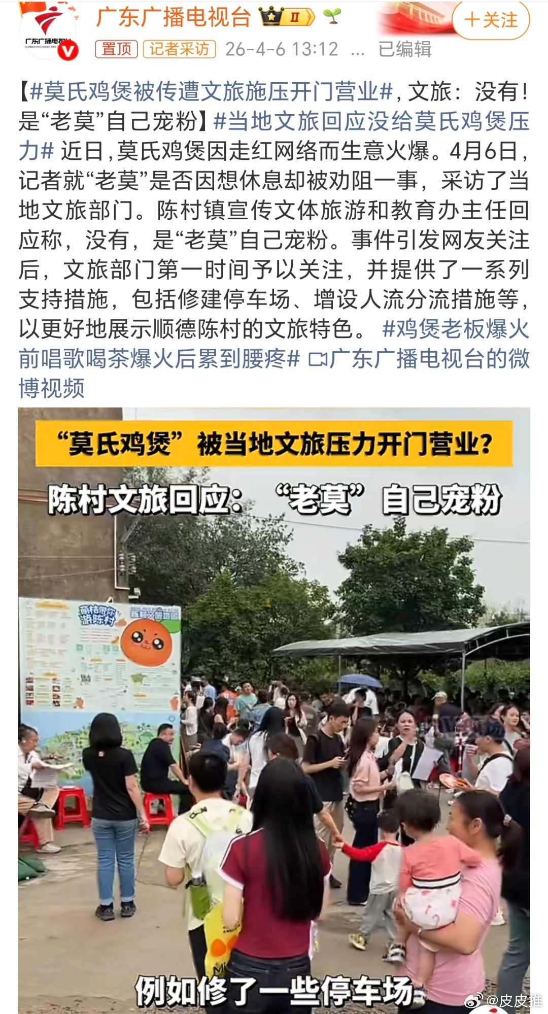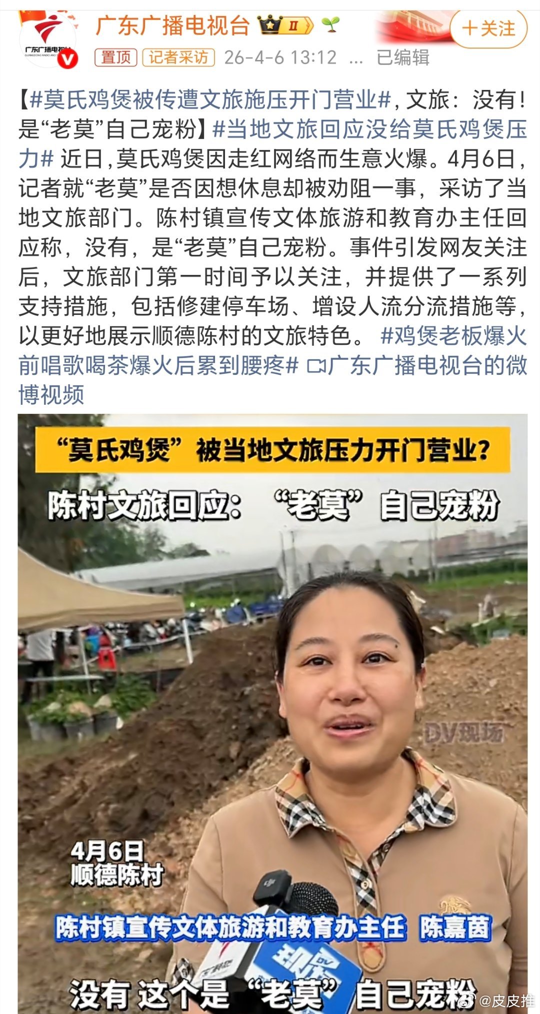 对于这个传言,媒体采访了当地文旅部门的工作人员。工作人员表示文旅部门并没有施压老莫,是老莫自己宠粉,相反文旅部门还修建了停车场,增加了一些分流措施,并且把当地的文旅特色呈现给大家。