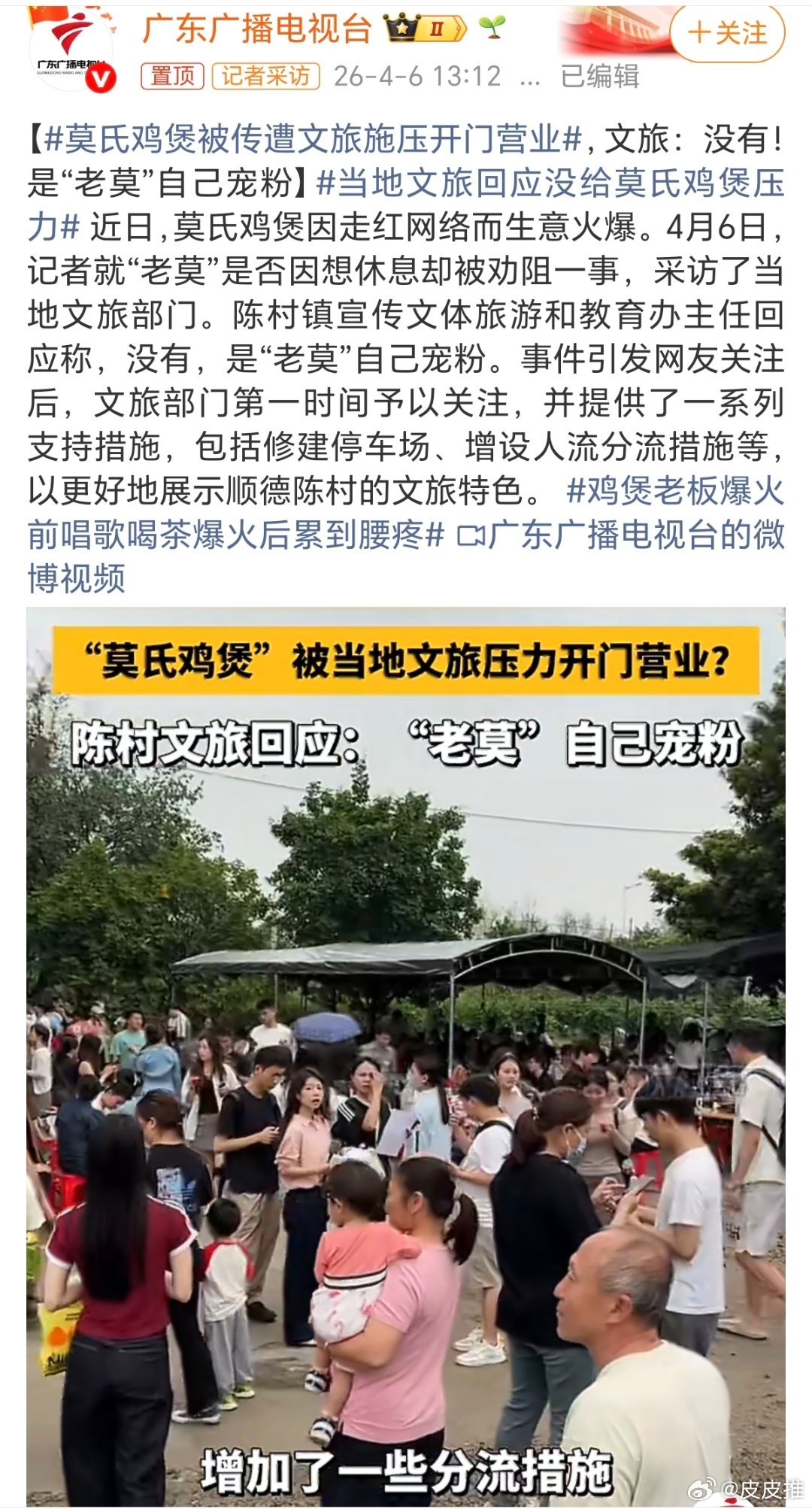 莫氏鸡煲被传遭文旅施压开门营业广东顺德的“莫氏鸡煲”被探店博主带火,每天去店里打卡的客人络绎不绝,不过,网上不少人说老莫想休息,却被地方文旅施压开门。