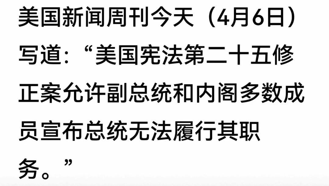 特朗普女儿证实特朗普住院,议员趁机推动罢免,事情没那么简单 4月6日,《新闻周刊》爆料:美国宪法第二十五修正案允许副总统和内阁多数宣布总统无法履职。多名议员已据此呼吁罢免特朗普——理由是他复活节期间公开威胁轰炸伊朗民用设施,言辞失控,朝野认定其已丧失理性判断能力。 巧合的是,就在刚刚,特朗普女儿刚证实他住进了沃尔特·里德医院。白宫此前还紧急辟谣,结果被自家人打脸。3月28日他对伊朗下48小时最后通牒,随后人间蒸发整整一周。 是身体真垮了,还是有人借机逼宫?修正案成了“制度抓手”,但谁在背后推波助澜?细品。