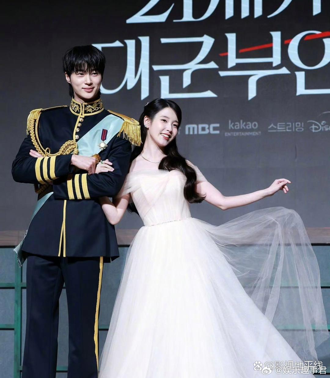 IU、边佑锡今日出席新剧《21世纪大君夫人》发布会,两人复刻剧中造型,同框比心。
