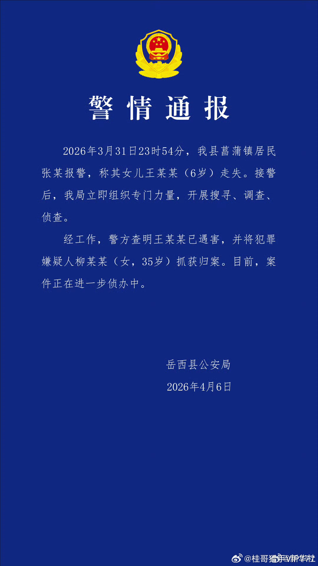 6日晚,当地发布通报称,该女童已遇害,犯罪嫌疑人柳某某(女,35岁)已被警方抓获归案。