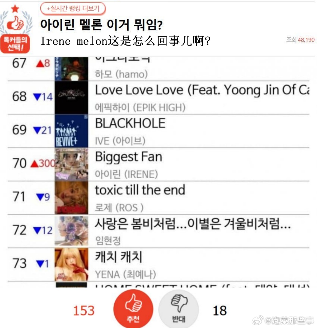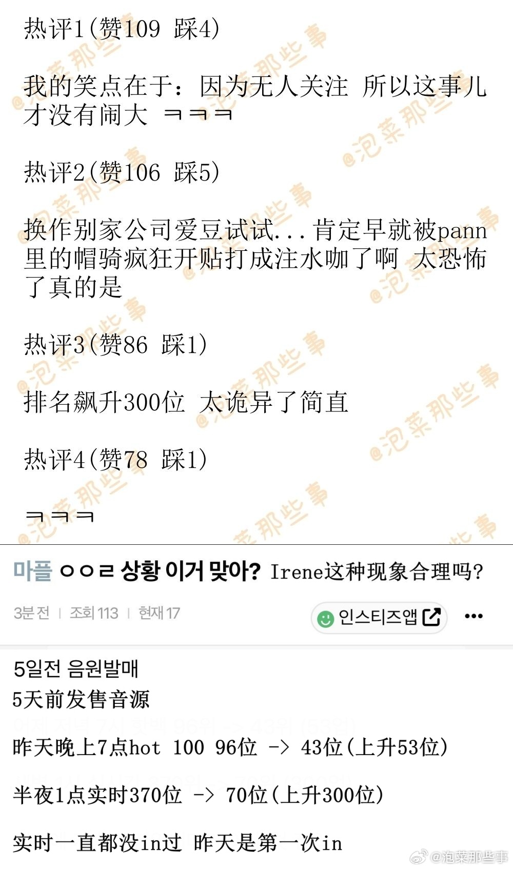 =🔥韩网热帖评论翻译🔥Irene裴珠泫瓜榜这是怎么回事儿啊?韩网原帖帖主发问:Irene瓜榜这是怎么回事儿啊? 半夜1点排名突然飙升300位 粉丝并没有发起总攻 也没有音源总攻组织 太不可思议了吧这也?cr.pann