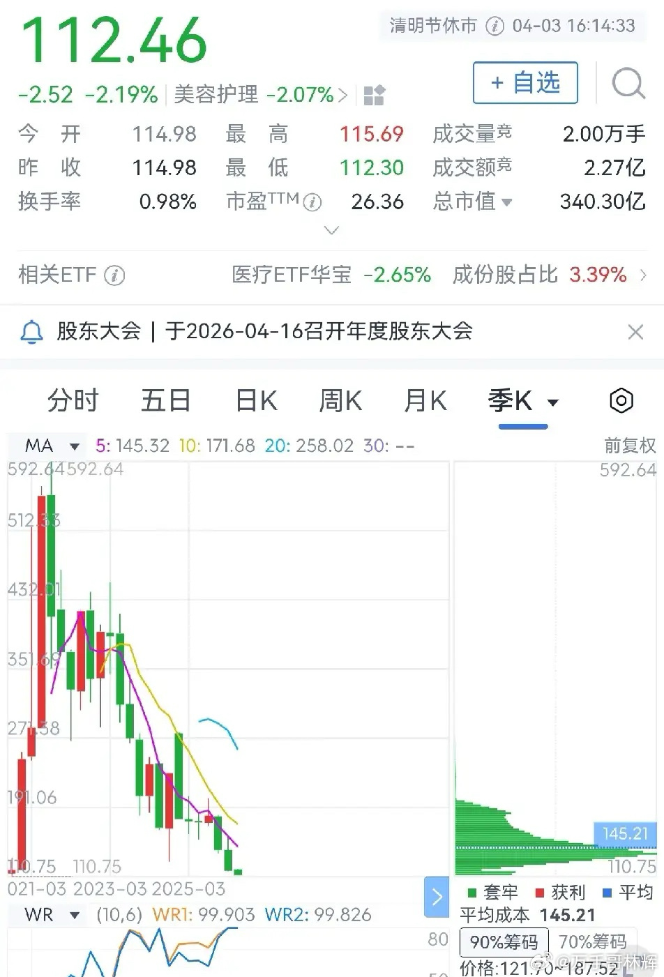 即便爱美客有如此强的盈利能力,可股价还是创下近一年新低,52周内最低112.3元,最高201.69元,市盈率26.36倍,股息率4.43%,也不低了,可目前股东们的平均持有成本是145.21元,可见都是被套牢的。