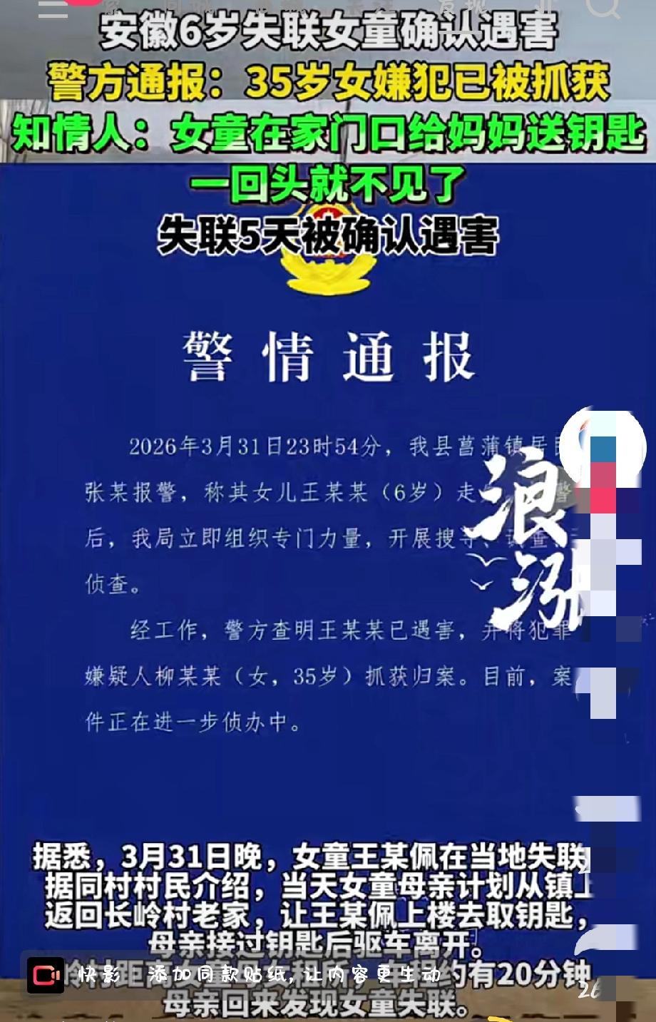 痛心,一个成年人杀害6岁的孩子究竟是有多大的仇呢?6岁女孩儿给妈妈送完钥匙却失踪了!35岁嫌疑人落网 事情发生在安徽省安庆市岳西县菖蒲镇。2026年3月31日晚上8点左右,6岁的王某佩正在家楼下的奶茶店蹭网,这是她常去的地方。突然,她听到妈妈喊她拿钥匙的声音,孩子立刻上楼取了钥匙,跑下楼递给了妈妈。 当时,王某佩的妈妈正计划开车回长岭村老家,车程大约20分钟。妈妈接过钥匙后,亲眼看着女儿转身走进一条宽约7米、长约10米的小路,路的尽头就是上楼的楼梯口,从那里可以回到三楼的家中。随后,妈妈放心地驱车离开了。 可当20多分钟后妈妈到达老家,却发现女儿根本没有回来。起初她以为孩子在楼下玩,没太在意。可等到晚上快9点还不见人,全家这才慌了。他们连夜赶回镇上寻找,找遍了整栋楼,找遍了巷子,找遍了附近的奶茶店、文具店,都没有孩子的踪影。 接到报警后,岳西县公安局迅速部署警力赶赴菖蒲镇,联合镇村干部、热心群众一共100多人,对事发区域展开拉网式排查。搜救过程中,工作组动用了警犬、无人机等技术手段,对重点区域进行全方位搜寻。 可搜救的过程却异常诡异。训练有素的警犬沿着佩佩的气味追踪,一路追到巷子拐角处,突然停下了,来回打转,就是找不到下一步的方向。有搜救经验的人一眼就看出了问题——气味在拐角处凭空断了。能做到这一点的,只有一种可能:孩子在这里被抱了起来,双脚离地,不再留下足迹和气味。换句话说,佩佩不是自己走丢的,是被人带走的。 更让人细思极恐的是,佩佩平时随身带着一部旧手机,虽然没有SIM卡,但可以连WiFi刷视频、玩游戏,从不离手。可警方在搜救过程中,竟然在附近菜地的一条水沟里找到了这部手机。手机泡水后屏幕漆黑,显然被人故意丢弃,试图销毁线索。 4月6日晚上,岳西县公安局发布警情通报:警方查明王某某已遇害,并将犯罪嫌疑人柳某某(女,35岁)抓获归案。这也意味着警方已经掌握了嫌疑人杀害女童的犯罪事实证据,那么女孩儿又与嫌疑人在哪里被找到的,一个35岁的成年人为什么要向一个6岁的孩子行凶呢?所有的疑问都有待于最终真相的公布,这种人法理难容,天理不容,必须严惩凶手!