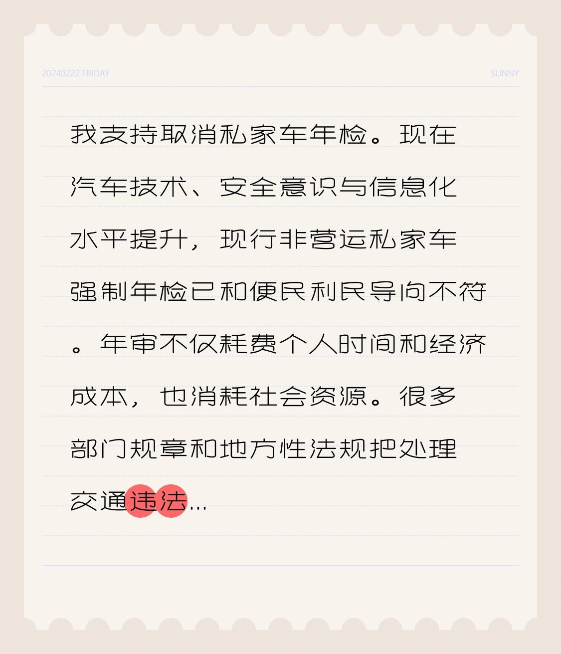我支持取消私家车年检。现在汽车技术、安全意识与信息化水平提升,现行非营运私家车强制年检已和便民利民导向不符。 年审不仅耗费个人时间和经济成本,也消耗社会资源。很多部门规章和地方性法规把处理交通违法作为核发年检合格标志的前置条件,让年检偏离安全检测初衷。而且现在的车都很智能,新能源汽车基本具备远程监测等能力,一般燃油车也智能化了,有故障车辆自己会报故障码。平时车主也会好好保养车,年检时轰大油门还像故意毁车。所以,取消私家车年检很有必要。