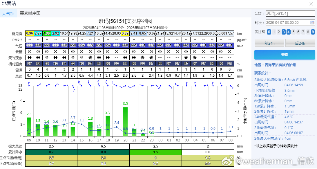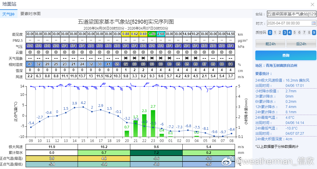 【降雪】昨天到今晨,西藏东北部、青海中南部、四川东北部、黑龙江、吉林多地出现降雪。部分站点出现大雪-暴雪。青海的班玛雨雪混杂,降水量有19毫米。青海五道梁出现大雪,积雪4厘米。黑龙江抚远也出现大雪,积雪有12厘米。今天东北降雪结束,青藏高原的降雪减弱。但明天在西藏西南部,可能还有强降雪。