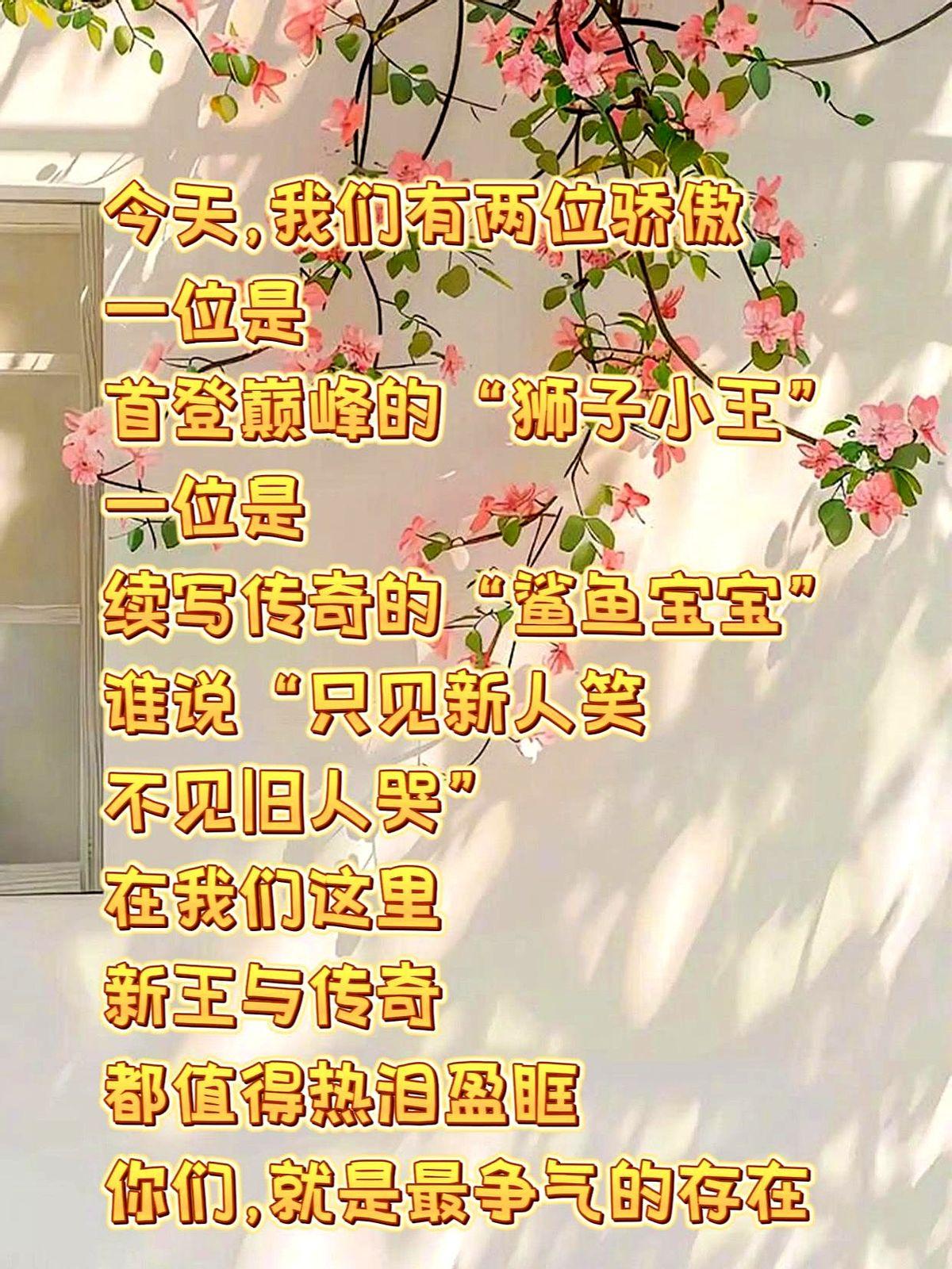 谁说只见新人笑?狮子小王和鲨鱼宝宝这次真的让我看哭了。 恭喜狮子小王正式加冕。这个新晋的冠军拿得真稳当,确实是凭本事自己闯出来的,一点都不含糊。 还要再祝贺一遍鲨鱼宝宝。这位老将再次拿到属于自己的荣誉,传奇地位根本没人能撼动,依然是那个最顶尖的存在。 看着他们两个都这么争气,心里没半点酸溜溜,全是感动。新王和传奇同场闪耀,这种场面看多少遍都不够。 你们就是这个圈子最争气的代表。看到这一幕,大家心里是什么滋味?