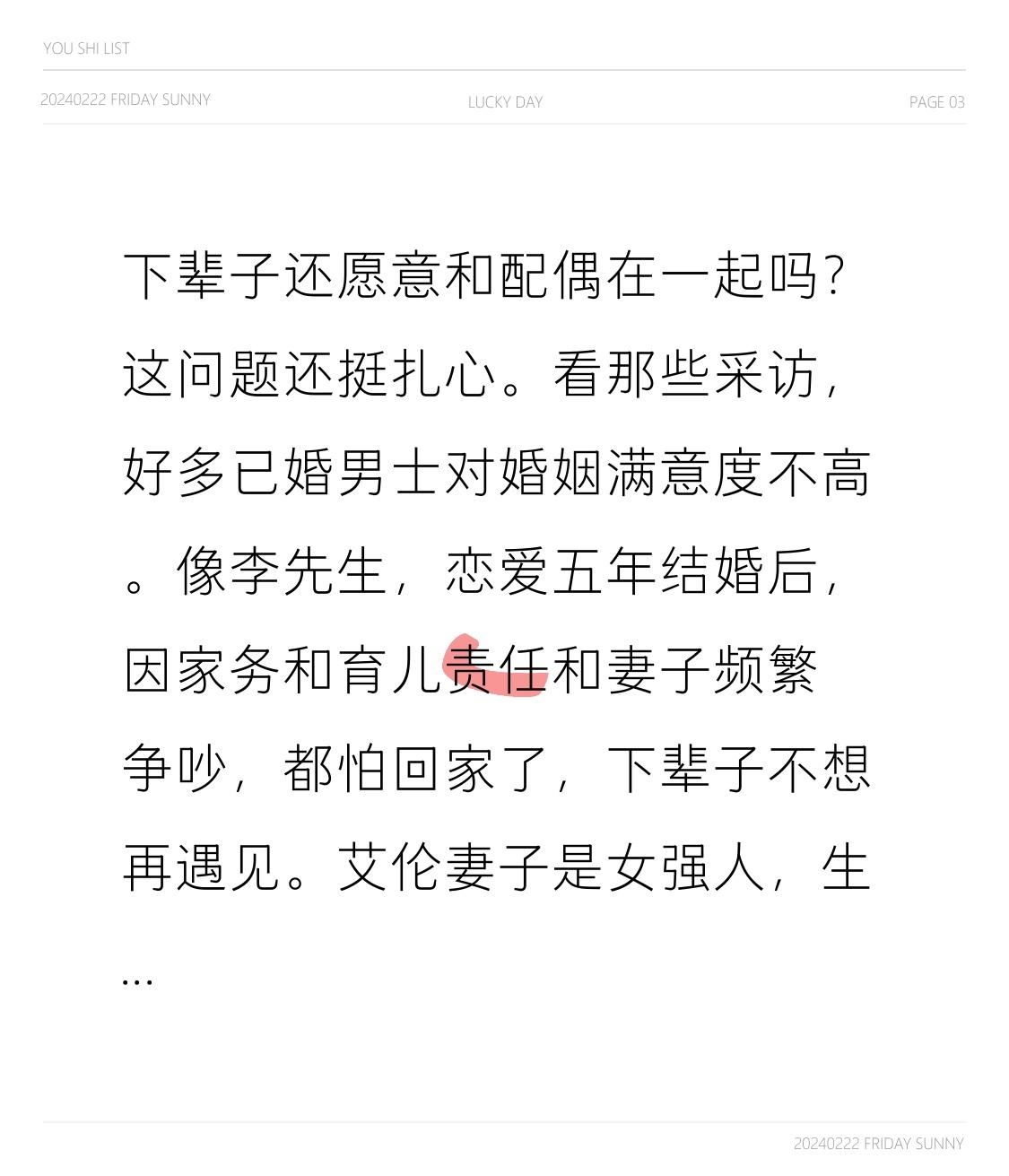 下辈子还愿意和配偶在一起吗?这问题还挺扎心。看那些采访,好多已婚男士对婚姻满意度不高。像李先生,恋爱五年结婚后,因家务和育儿责任和妻子频繁争吵,都怕回家了,下辈子不想再遇见。艾伦妻子是女强人,生活上啥都不会,他想换个温柔贤淑的。 想想父辈们,像文中80岁老妈那代,女人内外兼顾,男人回家啥都不干,她们也默默扛着。但到我们这代,很多人觉得有些路走一次就够了。要是问我,我可能也会犹豫,婚姻里的琐事和矛盾,真让人疲惫,下辈子还选TA,真得好好琢磨琢磨。