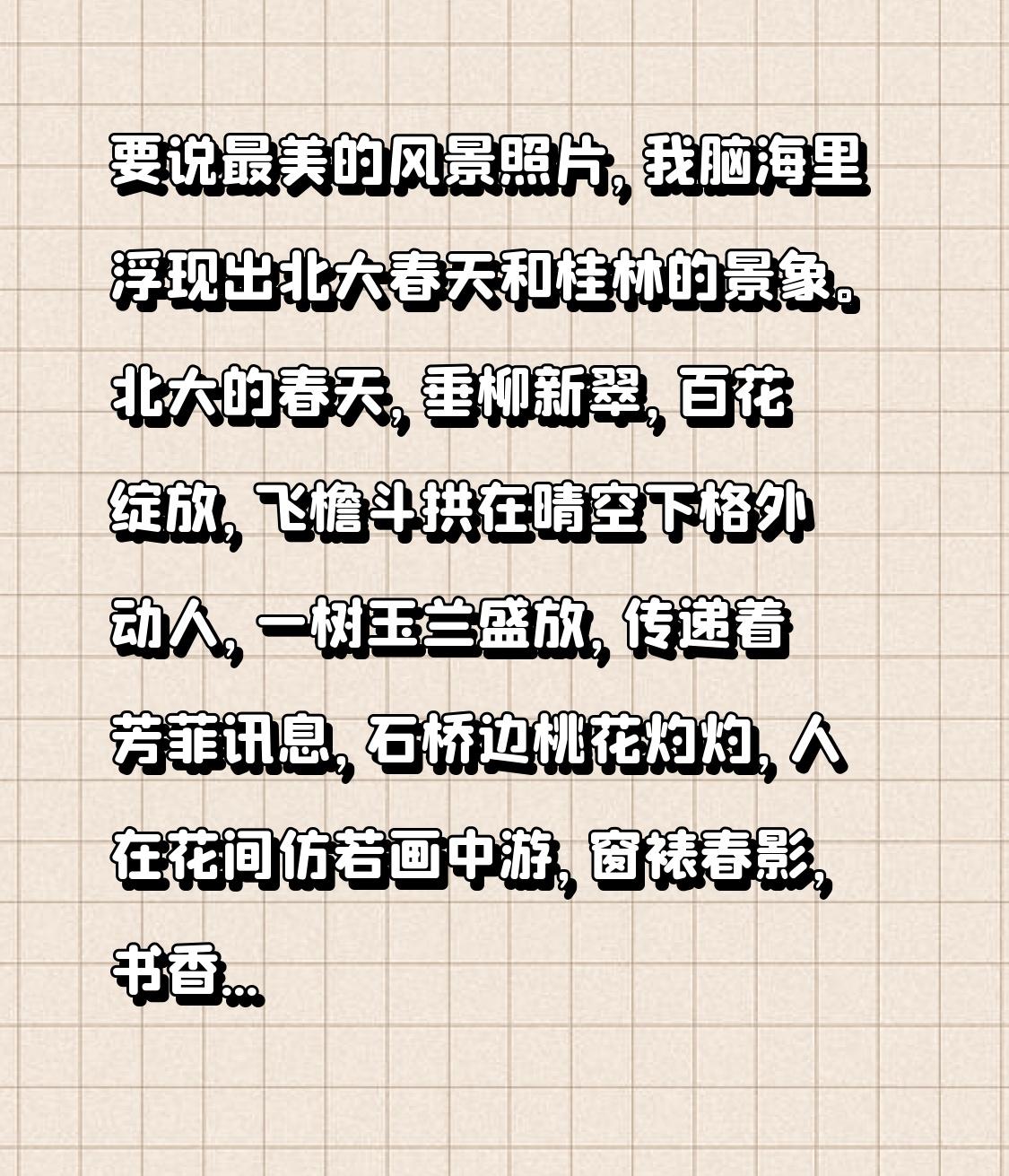 要说最美的风景照片,我脑海里浮现出北大春天和桂林的景象。北大的春天,垂柳新翠,百花绽放,飞檐斗拱在晴空下格外动人,一树玉兰盛放,传递着芳菲讯息,石桥边桃花灼灼,人在花间仿若画中游,窗裱春影,书香满庭,小动物也融入这春日盛景。 而桂林同样美得令人窒息。龙脊梯田历史悠久,田垄美景如人间仙境;象鼻山形似饮水大象,栩栩如生;日月双塔是两江四湖核心景观,夜景更是美不胜收。这两处风景都各具特色,都能让人感受到大自然与人文交织的魅力,很难抉择哪张最美。