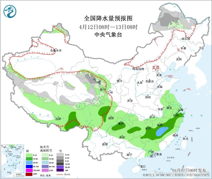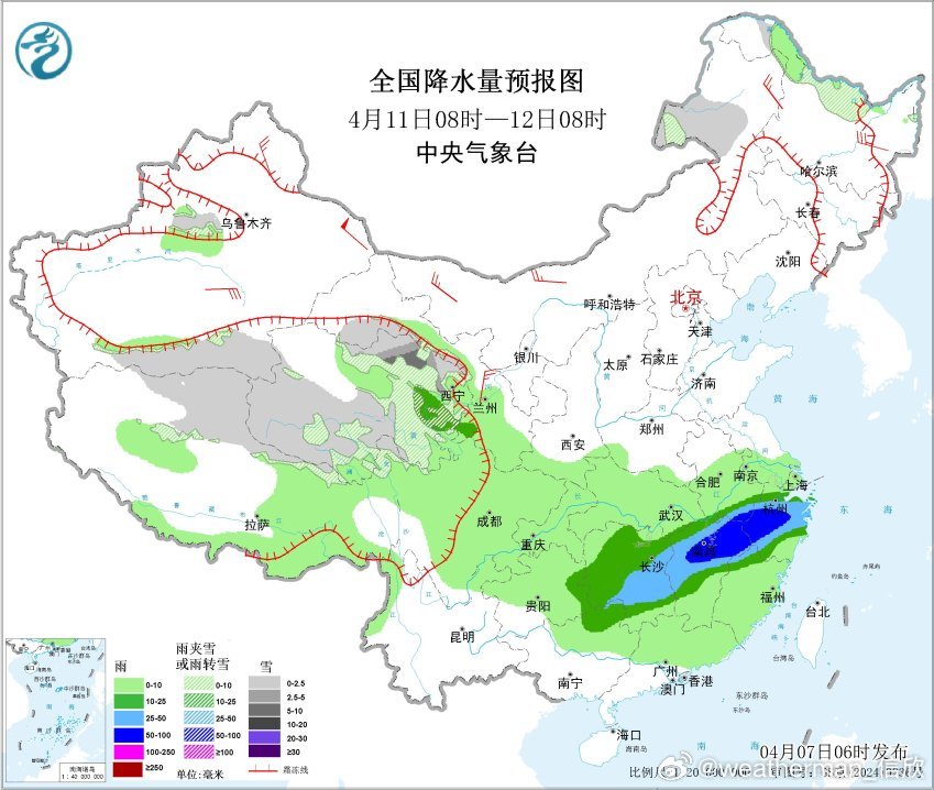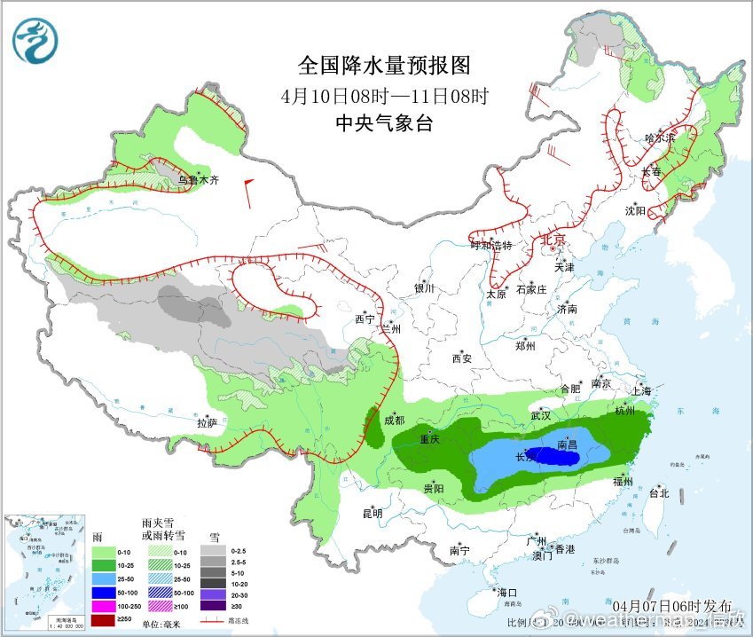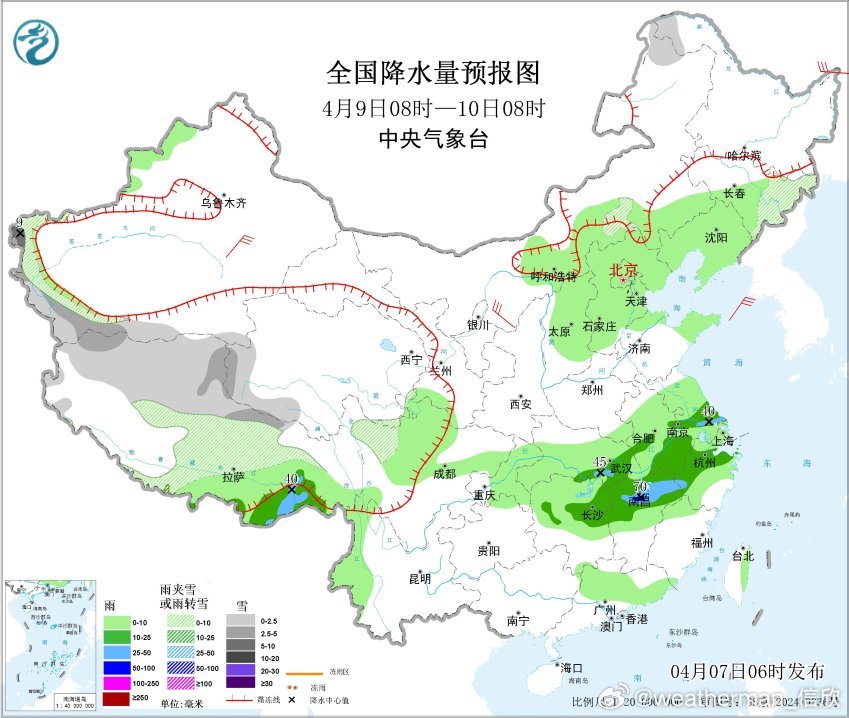 预计4月9日08时至10日08时,西藏东南部、江苏南部、安徽南部、江南北部、湖北东部等地部分地区有中到大雨,其中,江西北部等地局地有暴雨(50~70毫米)。目前看10-12日,降雨核心区还会维持在江南一带。