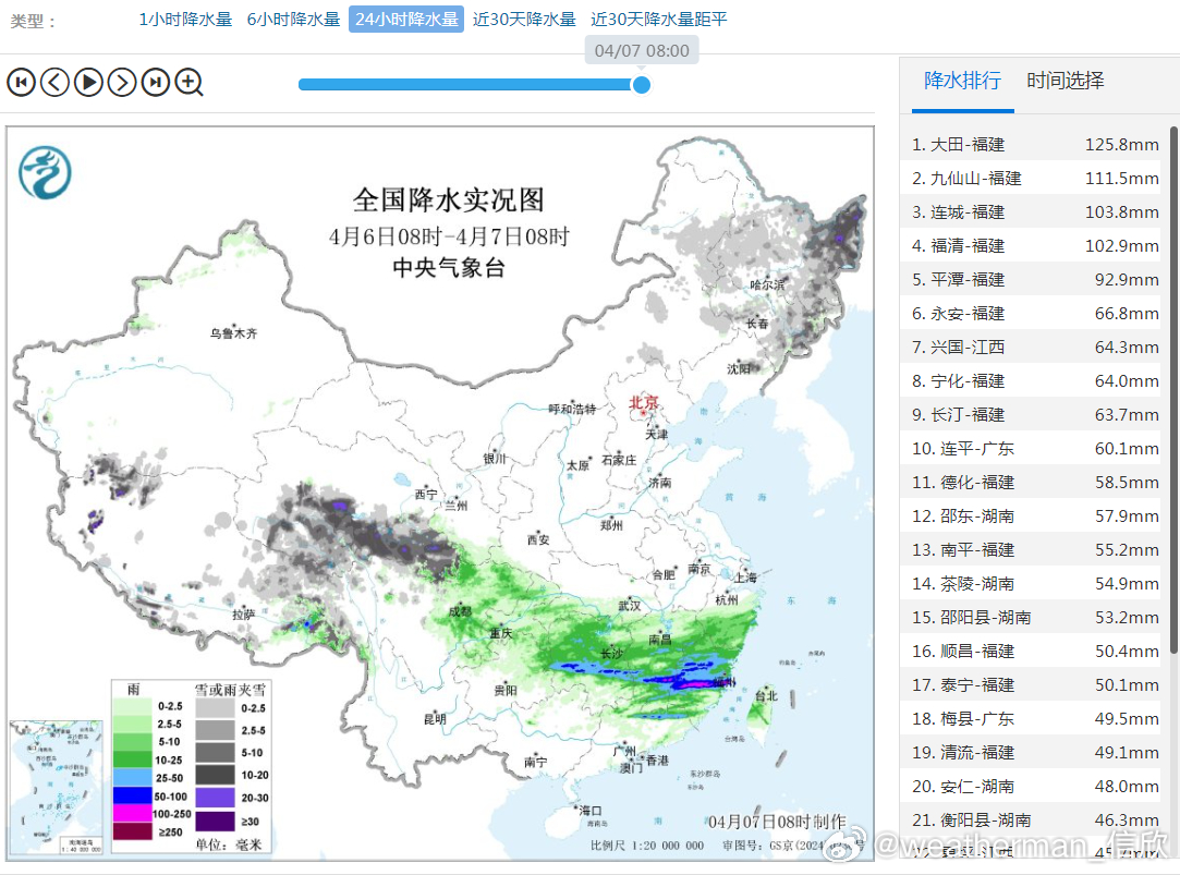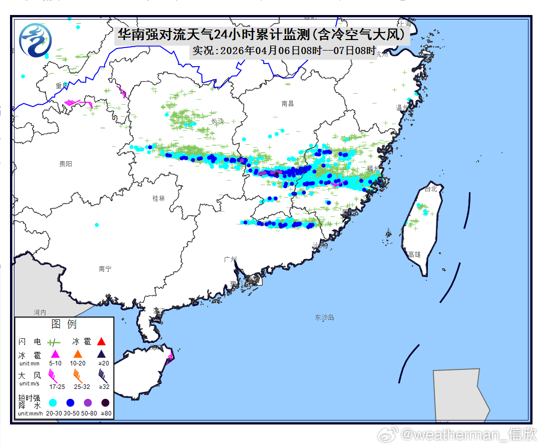 【强降雨和强对流】昨天到今晨,湖南中部、江西南部、广东北部、福建多地出现大雨-暴雨,并伴随短时强降雨,福建大田、九仙山、连城、福清,4站出现大暴雨。按照08时划断一天,大田、九仙山、连城,均打破了当地4月单日降水量纪录,九仙山也打破观测史最早的大暴雨日纪录,首次在4月出现大暴雨。