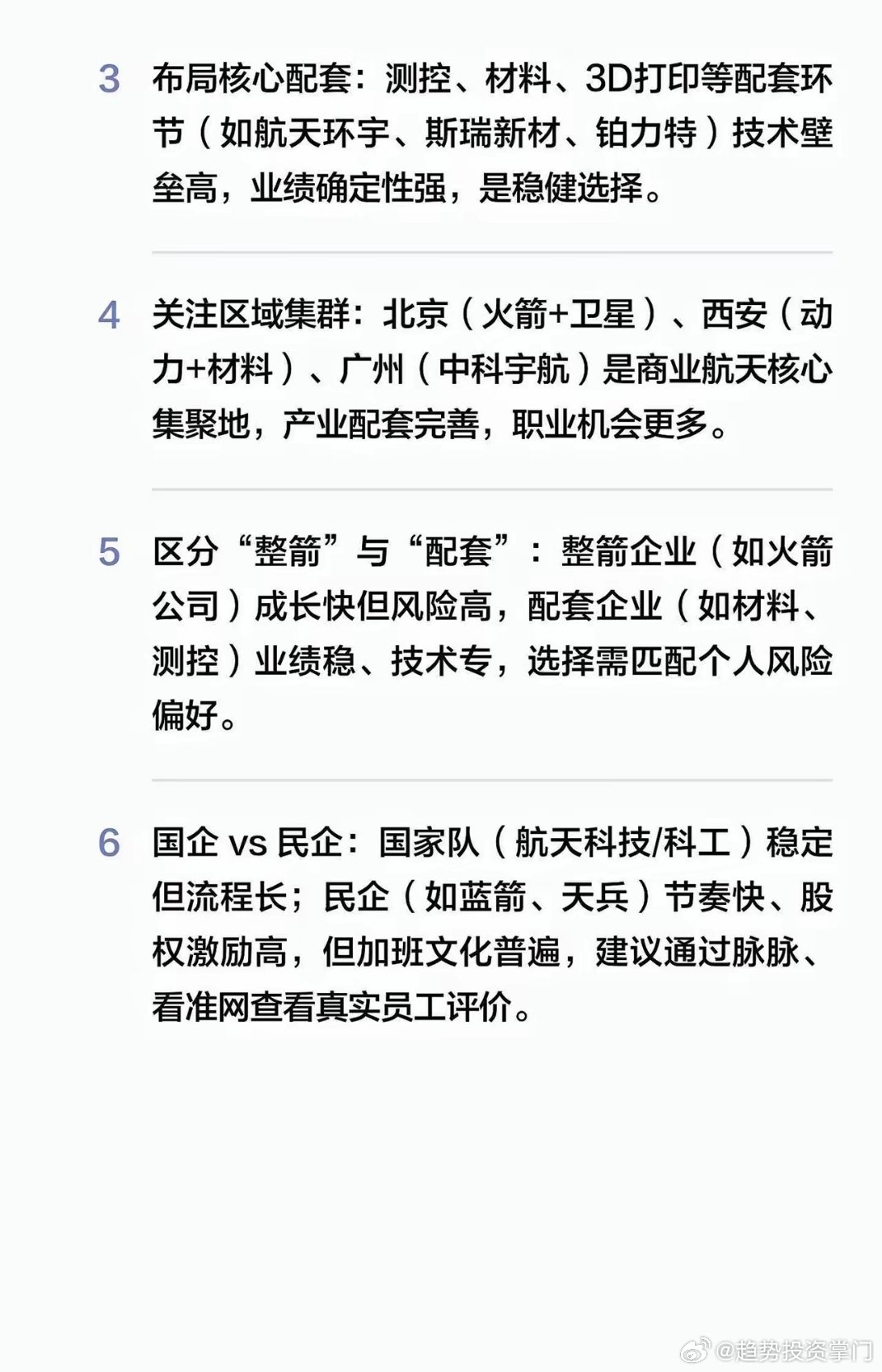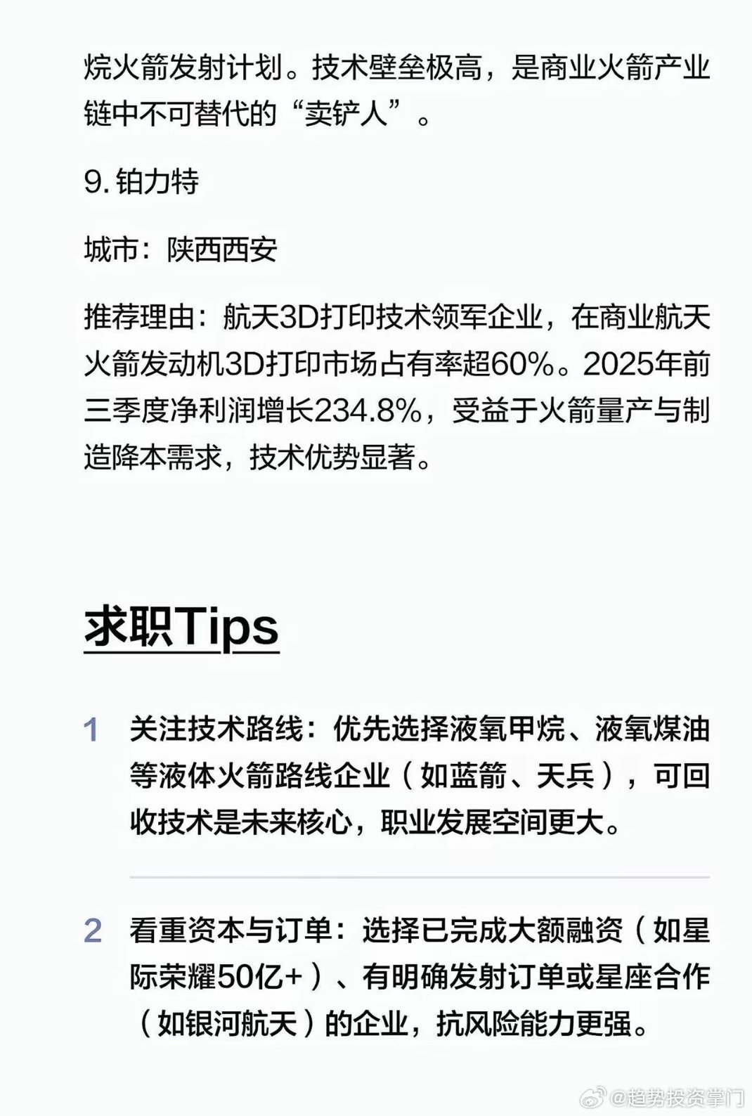 想进商业航天?这9家公司值得关注(附城市)求职要点1. 优先液体火箭路线(液氧甲烷/煤油),可回收技术成长空间更大2. 优选大额融资、有发射订单的企业,稳定性更强3. 测控、材料、3D打印等配套环节壁垒高,更稳健4. 北京、西安、广州产业集中,机会多、配套全5. 整箭企业成长快但风险高,配套企业更稳、专业性强6. 国企稳定流程长,民企节奏快激励高,可参考职场平台评价