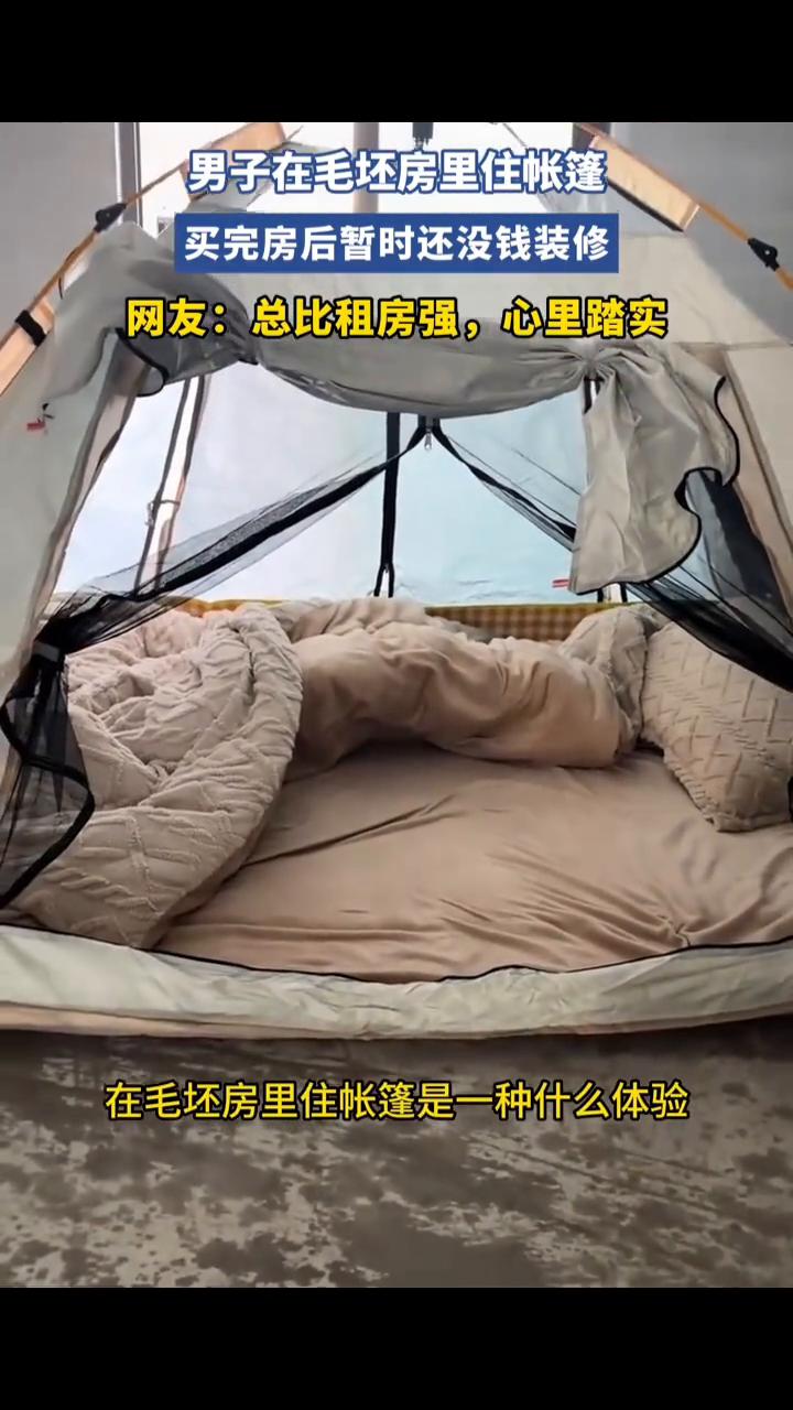 男子在毛坯房里住帐篷,买完房后暂时还没钱装修。网友:总比租房强,心里踏实。 4月5日浙江。朋友们,买完房子了,没钱装修,但是毛坯房有水有电。刚才把地面收拾了一下,今天晚上就住进帐篷里。今天带大家体验一下在毛坯房里住帐篷是一种什么体验。