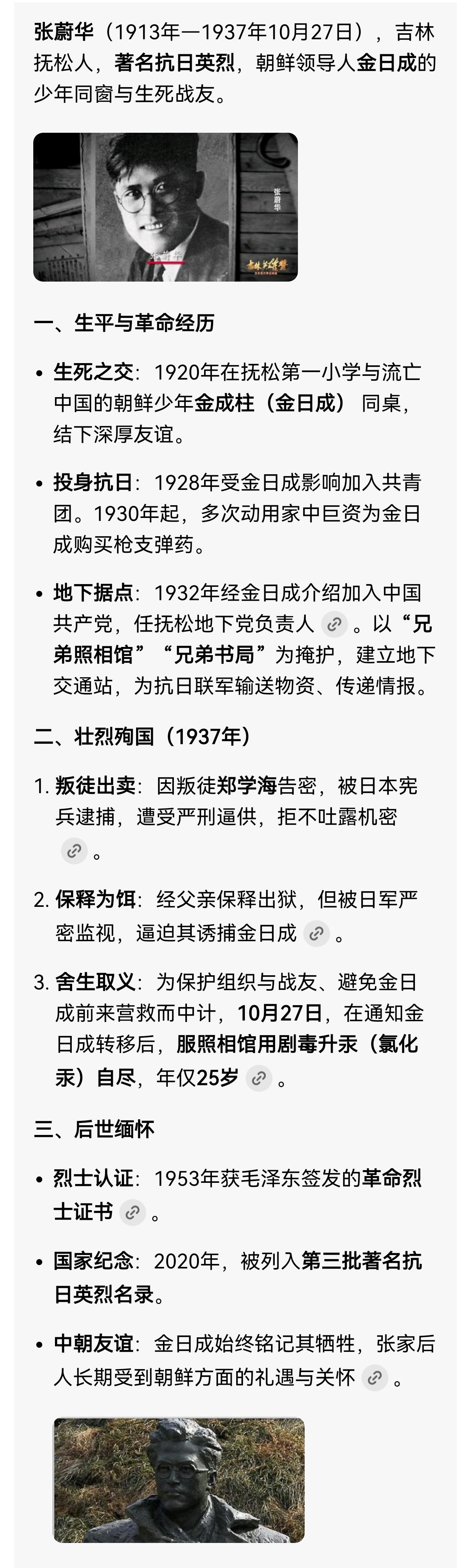金日成为以命相救的张蔚华烈士题写的碑文,毛笔汉字功力犹在。