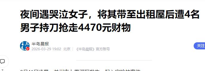 甘肃,一小伙深夜大街上,发现一美女正在哭泣,出于好心,将她带回出租屋安慰,岂料,刚将女孩带到屋没多久,突然闯进来4名带刀的陌生男子,说小伙侵犯女孩,抢走了小伙4400多块财物! 2026年3月12日中午,兰州七里河区的一处偏僻民房里,几个年轻人正围坐在桌前。还没等他们反应过来,房门就被猛地撞开,全副武装的刑警迅速控制了现场。 此时,距离案发仅仅过去了11个小时。在这个被一锅端掉的7人团伙里,20岁出头的田佳佳蜷缩在墙角,脸上再也没了前一晚那种惹人怜爱的柔弱,只剩下掩饰不住的慌张。 面对警察的讯问,这伙人起初还想抵赖,梗着脖子喊:这是家务事,我们就是找那个男的理论,这是民事纠纷。 事情的起因,要从11个小时前那个深夜说起。当时,小伙子赵建成下班回家,路过七里河区一段僻静路口时,看到了缩在路灯下的田佳佳。她低着头小声抽泣,看着孤苦无依。 赵建成停下脚步询问情况。田佳佳抬起头,红着眼睛说自己跟家里吵架跑了出来,手机没电关机了,身上没钱,也没地方去。 看着眼前这个比自己小不少的姑娘,赵建成的同情心一下子上来了。他觉得大半夜让一个女孩流落街头太不安全,便放松了警惕,提议先带她回自己的出租屋休息一下,充个电,等天亮再说。 但他怎么也没想到,自己领回去的并非一个需要帮助的弱女子,而是一个精准寻找目标的“诱饵”。 两人进屋后,田佳佳一边给手机充电,一边不停地摆弄手机。赵建成以为她在给家人发消息报平安,其实,她正忙着把这间屋子的定位发送给早已等候在附近的同伙。 屋里的安静没持续多久。随着一声巨响,房门被暴力踹开。四个壮汉拎着明刀冲了进来,领头的男人二话不说,直接把刀架在了赵建成的脖子上。 “胆子挺大啊,敢欺负我妹妹”带头的壮汉一边咆哮,一边开始在屋里翻箱倒柜。这套词,他们演练过很多次。故意往“家属出头”这种情感纠纷上引,就是为了万一被警察抓住,好拿“民事赔偿”当借口脱身。 这伙人动作极快,分工非常明确。有人负责拿刀顶着赵建成,有人负责搜身和翻柜子。很快,赵建成辛苦攒下的20多条香烟,加上兜里和抽屉里的4000多元现金,被洗劫得干干净净。 但这伙人显然低估了警方的办案效率。赵建成在确认对方离开后立刻报了案。兰州警方通过技术手段,迅速追踪到了田佳佳进屋后那段短暂的信号波动,并精准锁定了他们的藏身点。 不到半天时间,这伙人还没来得及处理掉抢来的香烟,手铐就落在了手腕上。 在法律面前,这套“家属讨说法”的戏码根本站不住脚。只要动了刀、进了屋、抢了钱,无论编出什么样的剧本,都属于严重的刑事犯罪。他们自以为聪明的“民事纠纷”幌子,在证据面前苍白无力。 案子破了,网上却传出了一些不和谐的声音。有人风言风语,觉得赵建成是“色迷心窍”,活该被骗。 这种论调极不负责任。在这起案件里,赵建成错在缺乏防范意识,但他内心想帮人的那份善良本没有错。真 正该被谴责的,是那些利用别人的善意、把施救者当成“提款机”的犯罪分子。如果全社会都开始对求助者视而不见,那才是最可悲的事情。 赵建成的遭遇也给我们所有人提了个醒,出门在外,防人之心不可无。面对深夜街头的陌生求助,最好的办法不是把人领回家,而是帮她拨打110寻求警方救助,或者指引她去附近的派出所、救助站。 法律已经惩处了恶人,而我们能做的,是学会保护那份带着锋芒的善良。记住,我们要防的从来不是“人”,而是那些利用人性弱点实施犯罪的贪婪与恶意。 信息来源:《夜间遇哭泣女子,将其带至出租屋后遭4名男子持刀抢走4470元财物》,半岛晨报,2026年3月29日。